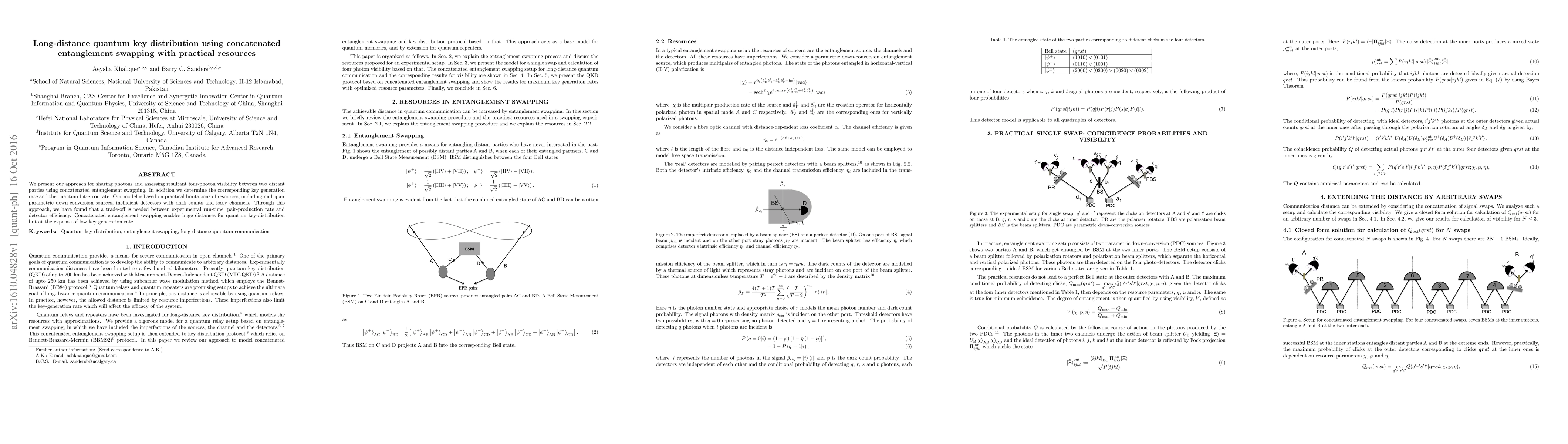 We present our approach for sharing photons and assessing resultant four-photon visibility between two distant parties using concatenated entanglement swapping. In addition we determine the corresponding key generation rate and the quantum bit-error rate. Our model is based on practical limitations of resources, including multipair parametric down-conversion sources, inefficient detectors with dark counts and lossy channels. Through this approach, we have found that a trade-off is needed between experimental run-time, pair-production rate and detector efficiency. Concatenated entanglement swapping enables huge distances for quantum key-distribution but at the expense of low key generation rate.