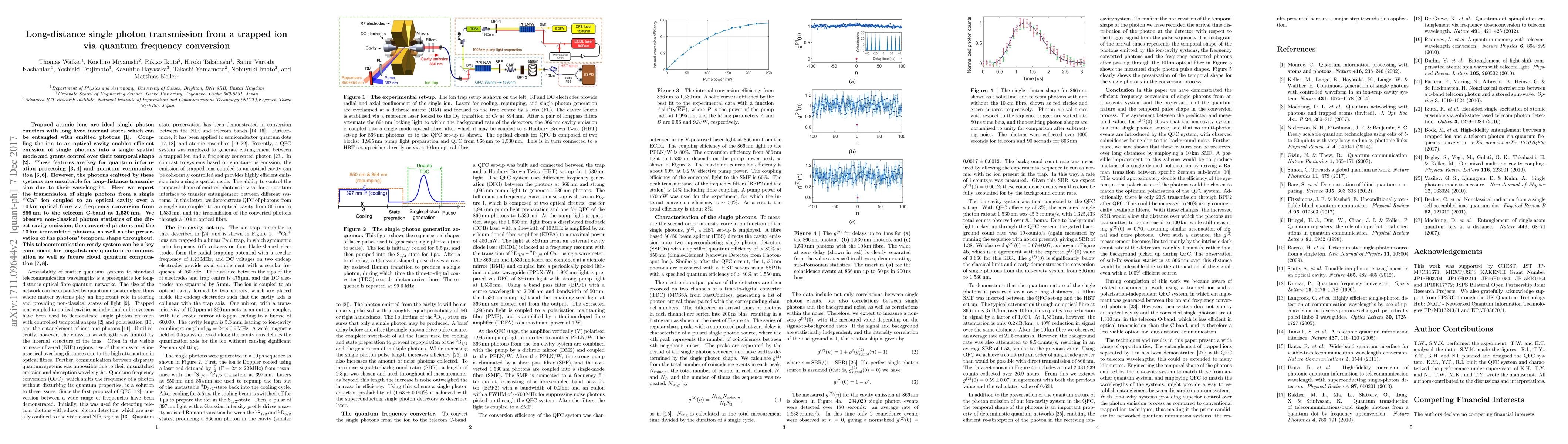 This paper reports the successful transmission of single photons from a trapped $^{40}\text{Ca}^{+}$ ion over 10 km via optical fibre, using quantum frequency conversion to shift the wavelength from 866 nm to the telecom C-band at 1,530 nm, preserving non-classical photon statistics and temporal shape. This method is crucial for long-distance quantum communication and cloud quantum computation.