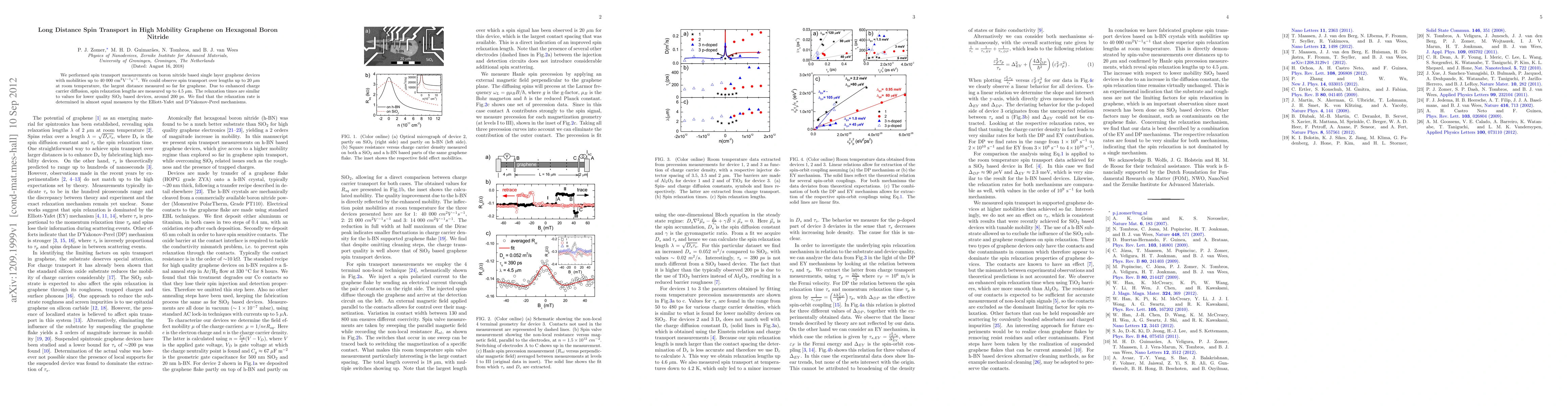 We performed spin transport measurements on boron nitride based single layer graphene devices with mobilities up to 40 000 cm${^2}$V$^{-1}$s$^{-1}$. We could observe spin transport over lengths up to 20 {\mu}m at room temperature, the largest distance measured so far for graphene. Due to enhanced charge carrier diffusion, spin relaxation lengths are measured up to 4.5 {\mu}m. The relaxation times are similar to values for lower quality SiO$_2$ based devices, around 200 ps. We find that the relaxation rate is determined in almost equal measures by the Elliott-Yafet and D'Yakonov-Perel mechanisms.