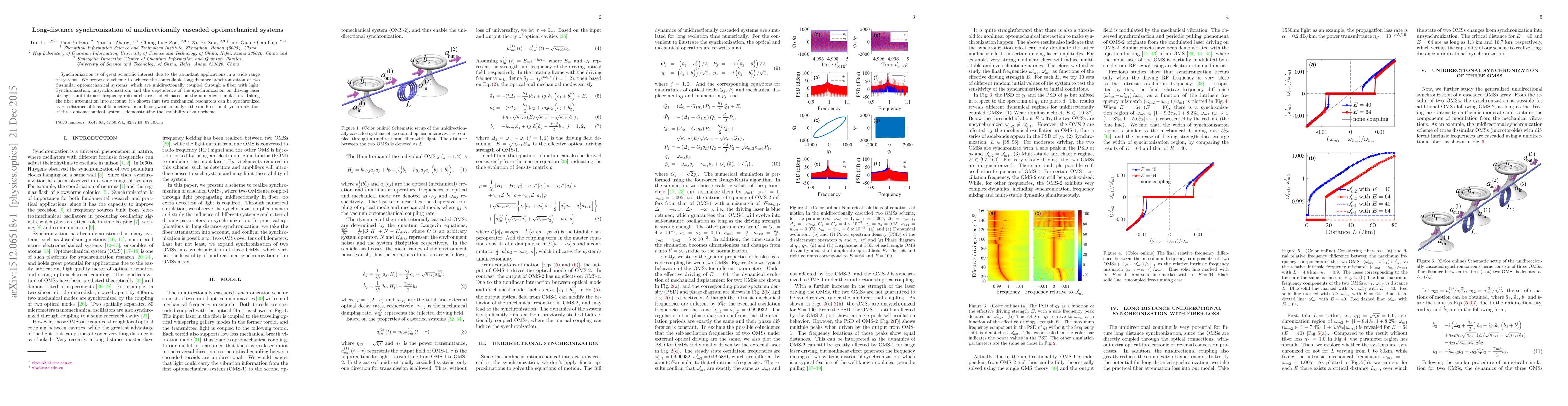 This paper proposes a method for achieving long-distance synchronization of two dissimilar optomechanical systems coupled via a fiber, demonstrating synchronization over tens of kilometers. The study explores the effects of driving laser strength, intrinsic frequency mismatch, and fiber attenuation on synchronization, and extends the findings to unidirectional synchronization of three systems.
