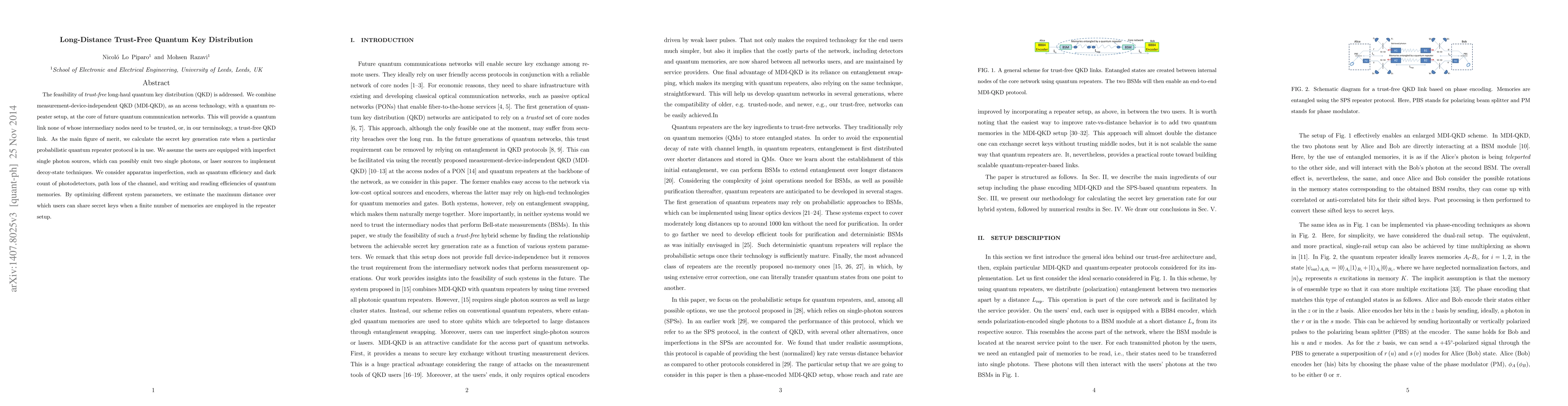 This paper explores the feasibility of trust-free long-distance quantum key distribution (QKD) by integrating measurement-device-independent QKD with a quantum repeater system. The study calculates the secret key generation rate under various imperfections and estimates the maximum distance for secure key sharing using finite quantum memories.
