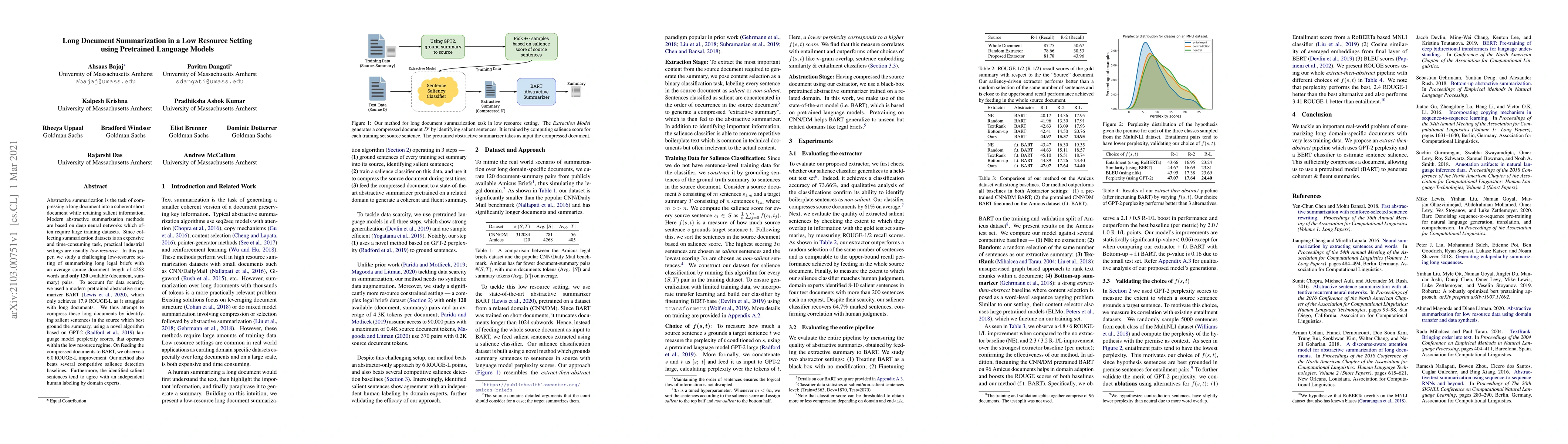 This paper explores abstractive summarization of long legal briefs in a low-resource setting using pretrained language models. It introduces a novel algorithm based on GPT-2 perplexity scores to identify salient sentences, which, when used to compress documents before summarizing with BART, improves ROUGE-L scores by 6.0 points.