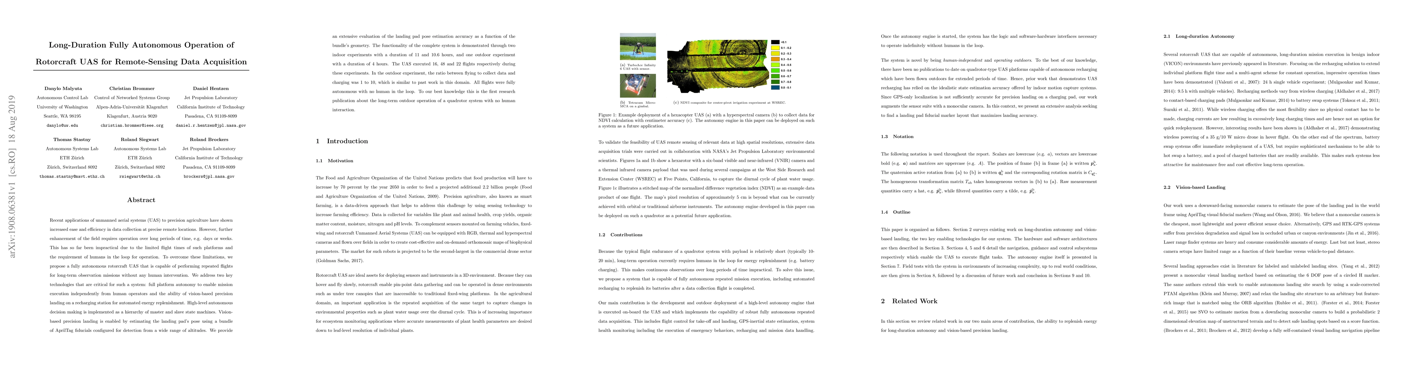 Recent applications of unmanned aerial systems (UAS) to precision agriculture have shown increased ease and efficiency in data collection at precise remote locations. However, further enhancement of the field requires operation over long periods of time, e.g. days or weeks. This has so far been impractical due to the limited flight times of such platforms and the requirement of humans in the loop for operation. To overcome these limitations, we propose a fully autonomous rotorcraft UAS that is capable of performing repeated flights for long-term observation missions without any human intervention. We address two key technologies that are critical for such a system: full platform autonomy to enable mission execution independently from human operators and the ability of vision-based precision landing on a recharging station for automated energy replenishment. High-level autonomous decision making is implemented as a hierarchy of master and slave state machines. Vision-based precision landing is enabled by estimating the landing pad's pose using a bundle of AprilTag fiducials configured for detection from a wide range of altitudes. We provide an extensive evaluation of the landing pad pose estimation accuracy as a function of the bundle's geometry. The functionality of the complete system is demonstrated through two indoor experiments with a duration of 11 and 10.6 hours, and one outdoor experiment with a duration of 4 hours. The UAS executed 16, 48 and 22 flights respectively during these experiments. In the outdoor experiment, the ratio between flying to collect data and charging was 1 to 10, which is similar to past work in this domain. All flights were fully autonomous with no human in the loop. To our best knowledge this is the first research publication about the long-term outdoor operation of a quadrotor system with no human interaction.