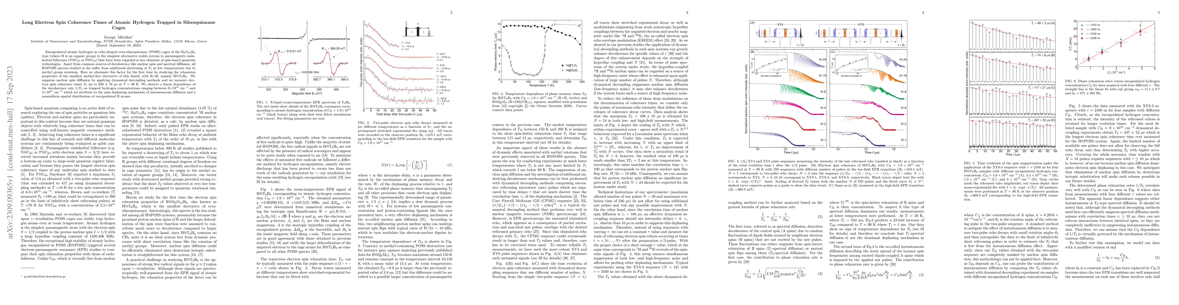 This paper investigates electron spin coherence times in atomic hydrogen encapsulated in methyl-free silsesquioxane cages, achieving long coherence times of up to 280 μs at 90 K by eliminating methyl group rotations and suppressing nuclear spin diffusion. The observed decoherence rate is linearly dependent on hydrogen concentration, attributed to spin dephasing mechanisms.