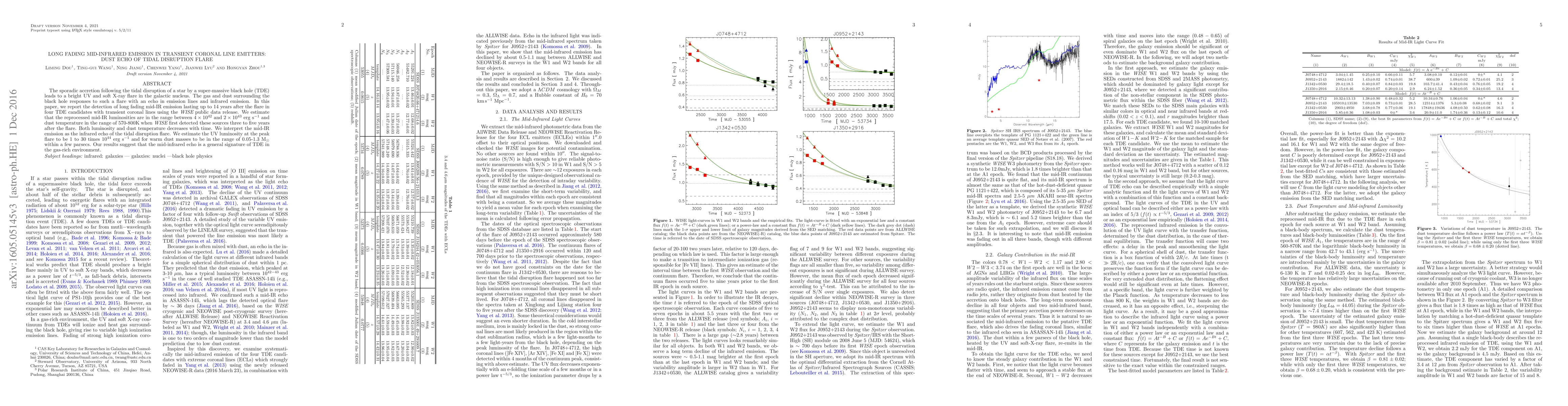 The sporadic accretion following the tidal disruption of a star by a super-massive black hole (TDE) leads to a bright UV and soft X-ray flare in the galactic nucleus. The gas and dust surrounding the black hole responses to such a flare with an echo in emission lines and infrared emission. In this paper, we report the detection of long fading mid-IR emission lasting up to 14 years after the flare in four TDE candidates with transient coronal lines using the WISE public data release. We estimate that the reprocessed mid-IR luminosities are in the range between $4\times 10^{42}$ and $2\times 10^{43}$ erg~s$^{-1}$ and dust temperature in the range of 570-800K when WISE first detected these sources three to five years after the flare. Both luminosity and dust temperature decreases with time. We interpret the mid-IR emission as the infrared echo of the tidal disruption flare. We estimate the UV luminosity at the peak flare to be 1 to 30 times $10^{44}$ erg s$^{-1}$ and for warm dust masses to be in the range of 0.05-1.3 Msun within a few parsecs. Our results suggest that the mid-infrared echo is a general signature of TDE in the gas-rich environment.