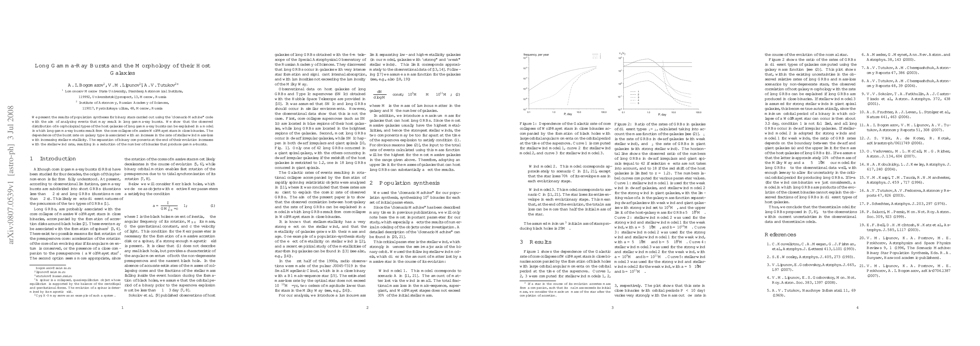 This paper uses the "Scenario Machine" code to model binary star populations and finds that long gamma-ray bursts originate from the core collapse of massive Wolf-Rayet stars in close binaries. The study correlates the morphology of host galaxies with the rate of gamma-ray bursts, linking the increased burst rate in certain galaxies to higher stellar metallicity and greater stellar-wind mass-loss.