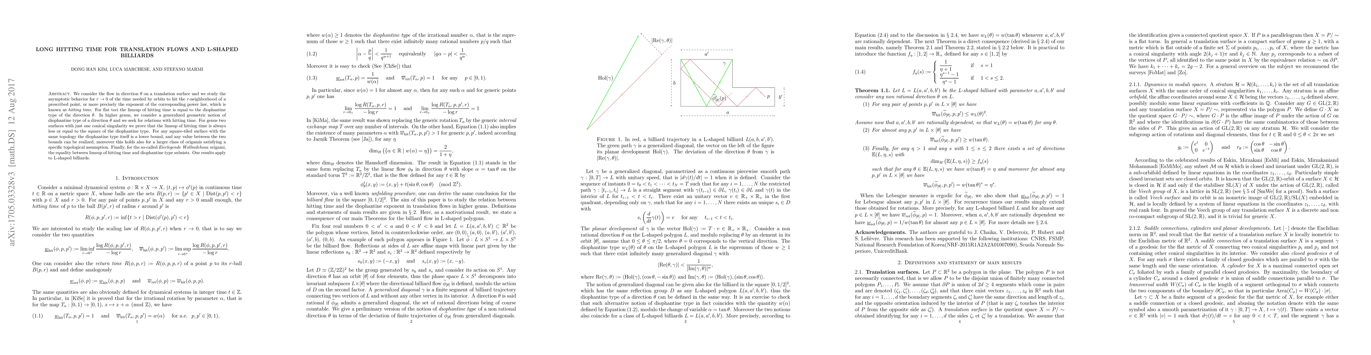 We consider the flow in direction $\theta$ on a translation surface and we study the asymptotic behavior for $r\to 0$ of the time needed by orbits to hit the $r$-neighborhood of a prescribed point, or more precisely the exponent of the corresponding power law, which is known as hitting time. For flat tori the limsup of hitting time is equal to the diophantine type of the direction $\theta$. In higher genus, we consider a generalized geometric notion of diophantine type of a direction $\theta$ and we seek for relations with hitting time. For genus two surfaces with just one conical singularity we prove that the limsup of hitting time is always less or equal to the square of the diophantine type. For any square-tiled surface with the same topology the diophantine type itself is a lower bound, and any value between the two bounds can be realized, moreover this holds also for a larger class of origamis satisfying a specific topological assumption. Finally, for the so-called Eierlegende Wollmilchsau origami, the equality between limsup of hitting time and diophantine type subsists. Our results apply to L-shaped billiards.