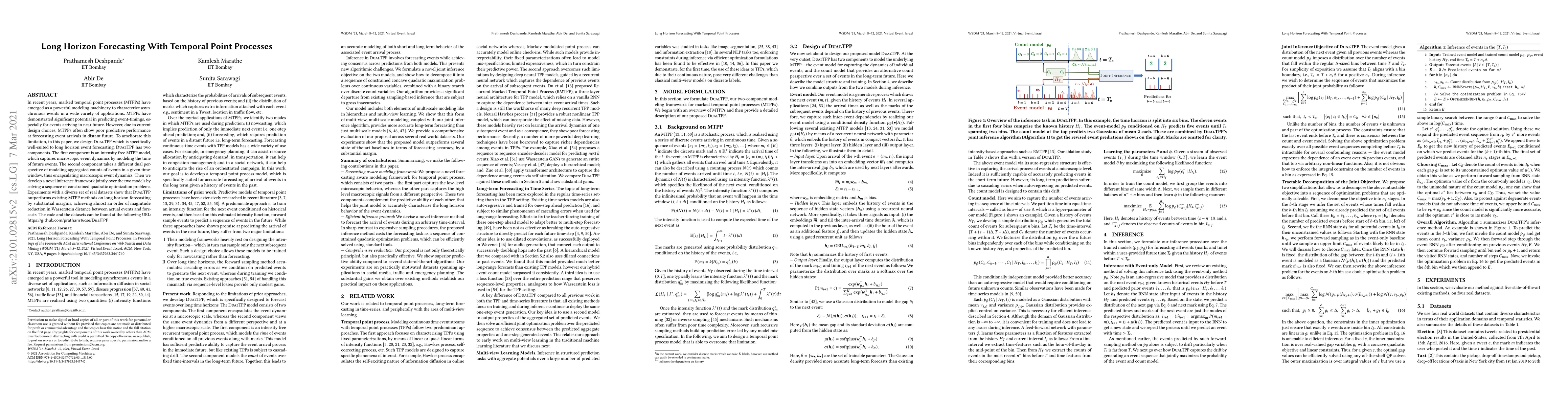 In recent years, marked temporal point processes (MTPPs) have emerged as a powerful modeling machinery to characterize asynchronous events in a wide variety of applications. MTPPs have demonstrated significant potential in predicting event-timings, especially for events arriving in near future. However, due to current design choices, MTPPs often show poor predictive performance at forecasting event arrivals in distant future. To ameliorate this limitation, in this paper, we design DualTPP which is specifically well-suited to long horizon event forecasting. DualTPP has two components. The first component is an intensity free MTPP model, which captures microscopic or granular level signals of the event dynamics by modeling the time of future events. The second component takes a different dual perspective of modeling aggregated counts of events in a given time-window, thus encapsulating macroscopic event dynamics. Then we develop a novel inference framework jointly over the two models % for efficiently forecasting long horizon events by solving a sequence of constrained quadratic optimization problems. Experiments with a diverse set of real datasets show that DualTPP outperforms existing MTPP methods on long horizon forecasting by substantial margins, achieving almost an order of magnitude reduction in Wasserstein distance between actual events and forecasts.