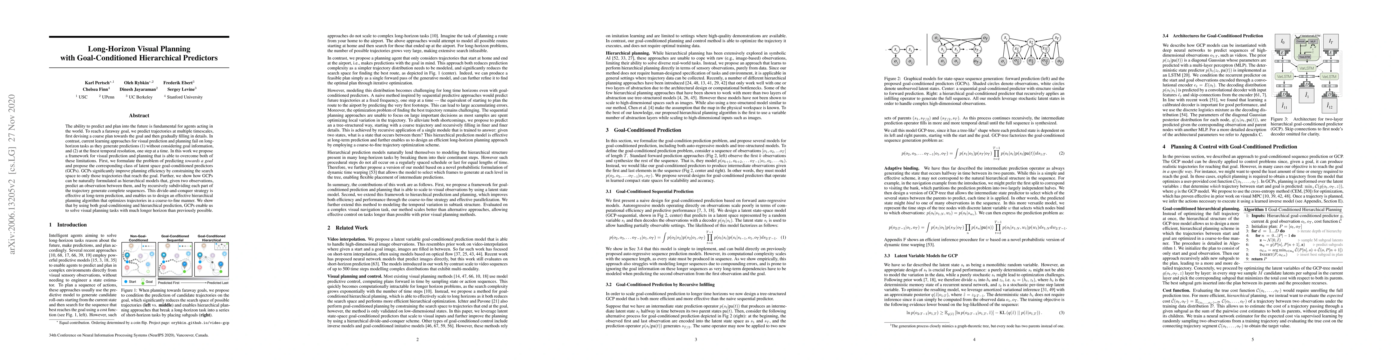This paper proposes a framework for long-horizon visual planning using goal-conditioned hierarchical predictors (GCPs) that improve planning efficiency by focusing on goal-oriented trajectories. The hierarchical approach enables effective long-term prediction and outperforms existing methods in visual planning tasks with extended horizons.
