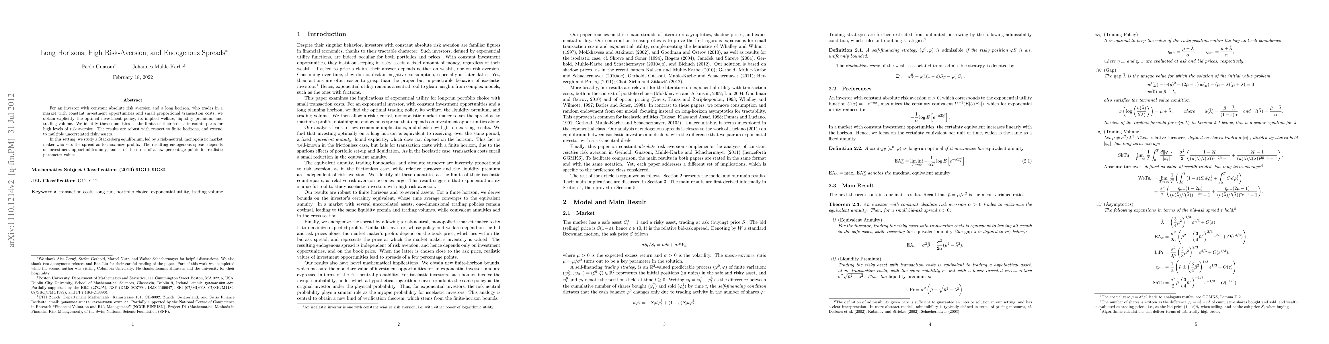 This paper derives the optimal investment policy for a long-horizon investor with high risk aversion, showing it converges to isoelastic limits. It also examines a Stackelberg equilibrium where a risk-neutral market maker sets an endogenous spread that depends solely on investment opportunities, resulting in small percentage spreads.
