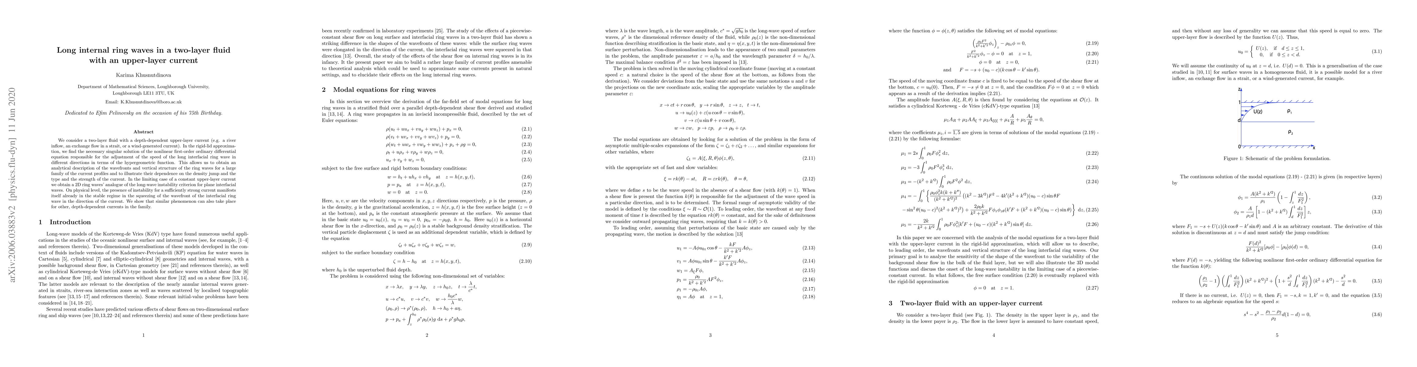 Researchers analyzed long internal ring waves in a two-layer fluid with an upper-layer current, finding that strong currents can cause instability and squeeze wavefronts in the direction of the current.