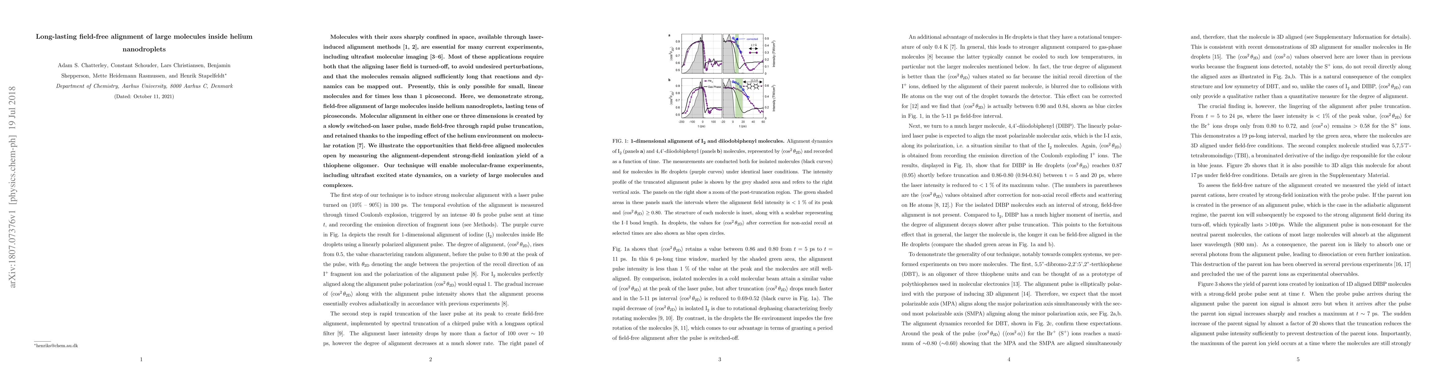 This paper presents a method for achieving long-lasting, field-free alignment of large molecules within helium nanodroplets, enabling ultrafast molecular imaging and dynamics studies. The technique uses a rapidly truncated laser pulse to create alignment that persists for tens of picoseconds, opening new avenues for molecular-frame experiments.