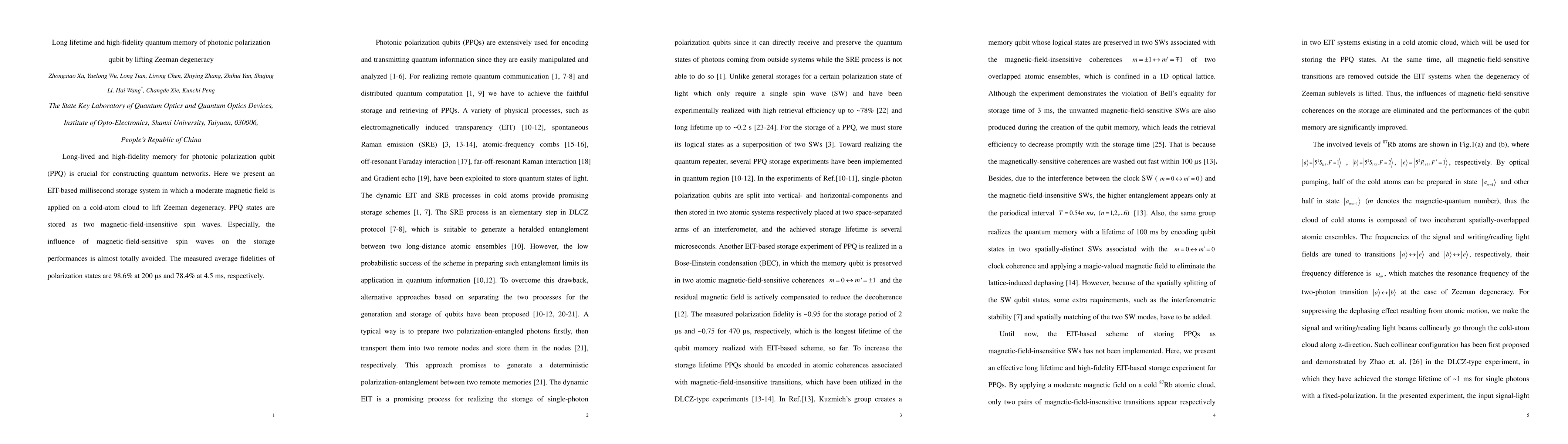 This paper presents an EIT-based quantum memory system that stores photonic polarization qubits using a cold-atom cloud with a moderate magnetic field to lift Zeeman degeneracy, achieving long-lived storage with average fidelities of 98.6% at 200 us and 78.4% at 4.5 ms. The system effectively avoids magnetic-field-sensitive spin waves, enhancing memory fidelity.