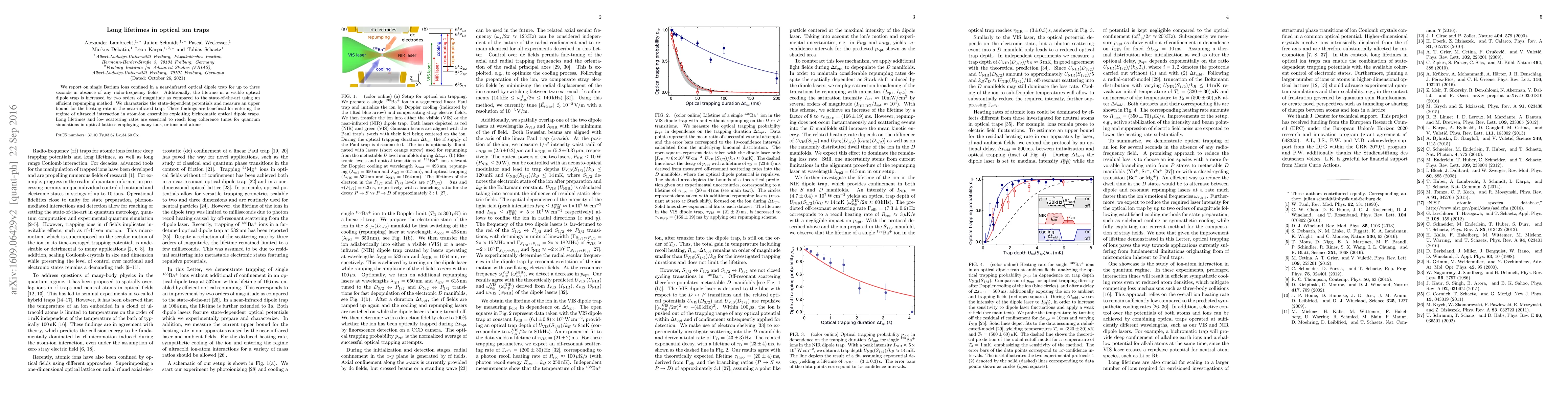This paper demonstrates the confinement of single Barium ions in optical dipole traps, achieving up to three seconds in a near-infrared trap and significantly enhancing the lifetime in a visible trap using an efficient repumping method. These results are crucial for achieving long coherence times in quantum simulations with ion-atom ensembles.