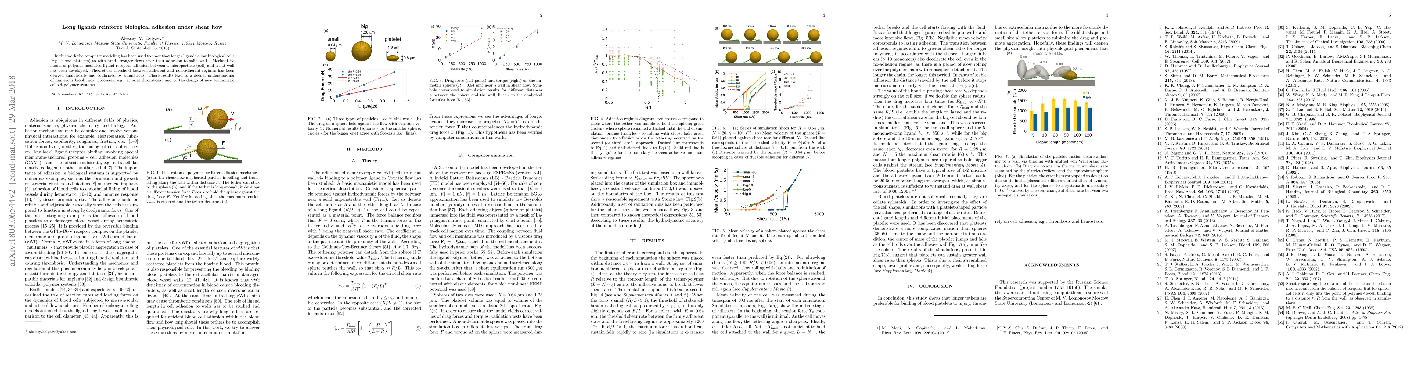 In this work the computer modeling has been used to show that longer ligands allow biological cells (e.g., blood platelets) to withstand stronger flows after their adhesion to solid walls. Mechanistic model of polymer-mediated ligand-receptor adhesion between a microparticle (cell) and a flat wall has been developed. Theoretical threshold between adherent and non-adherent regimes has been derived analytically and confirmed by simulations. These results lead to a deeper understanding of numerous biophysical processes, e.g., arterial thrombosis, and to the design of new biomimetic colloid-polymer systems.