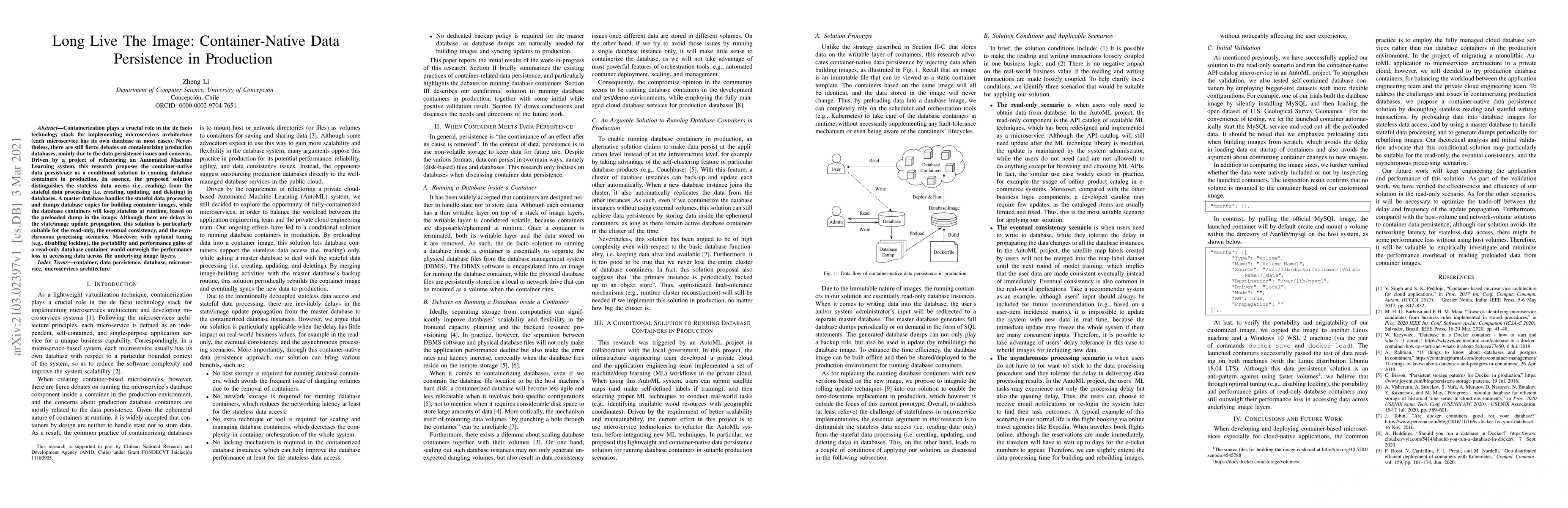 Containerization plays a crucial role in the de facto technology stack for implementing microservices architecture (each microservice has its own database in most cases). Nevertheless, there are still fierce debates on containerizing production databases, mainly due to the data persistence issues and concerns. Driven by a project of refactoring an Automated Machine Learning system, this research proposes the container-native data persistence as a conditional solution to running database containers in production. In essence, the proposed solution distinguishes the stateless data access (i.e. reading) from the stateful data processing (i.e. creating, updating, and deleting) in databases. A master database handles the stateful data processing and dumps database copies for building container images, while the database containers will keep stateless at runtime, based on the preloaded dump in the image. Although there are delays in the state/image update propagation, this solution is particularly suitable for the read-only, the eventual consistency, and the asynchronous processing scenarios. Moreover, with optimal tuning (e.g., disabling locking), the portability and performance gains of a read-only database container would outweigh the performance loss in accessing data across the underlying image layers.