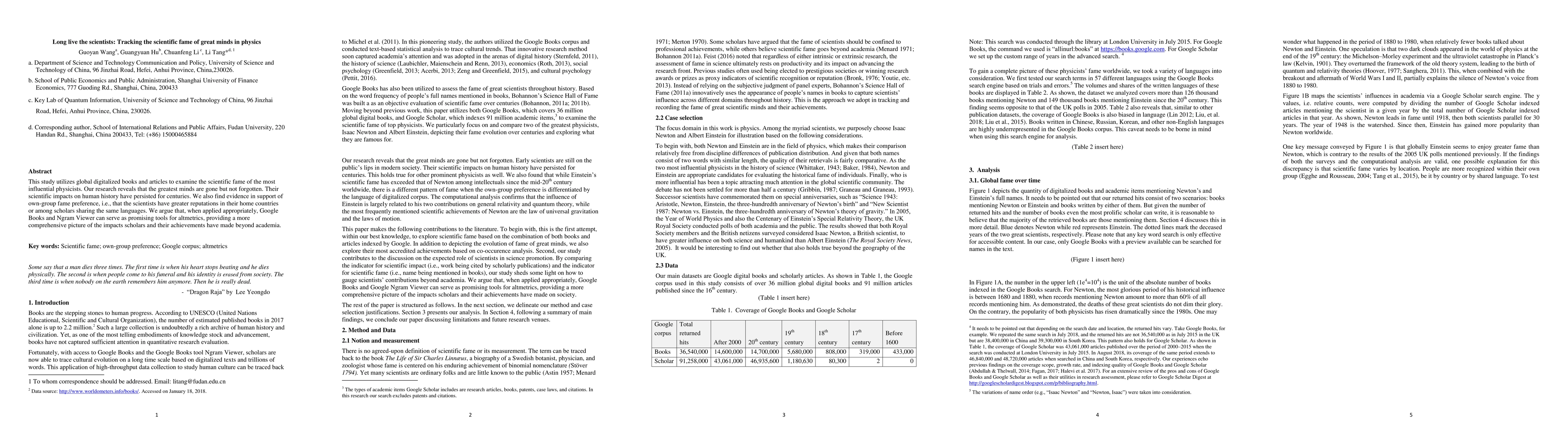 This study utilizes global digitalized books and articles to examine the scientific fame of the most influential physicists. Our research reveals that the greatest minds are gone but not forgotten. Their scientific impacts on human history have persisted for centuries. We also find evidence in support of own-group fame preference, i.e., that the scientists have greater reputations in their home countries or among scholars sharing the same languages. We argue that, when applied appropriately, Google Books and Ngram Viewer can serve as promising tools for altmetrics, providing a more comprehensive picture of the impacts scholars and their achievements have made beyond academia.