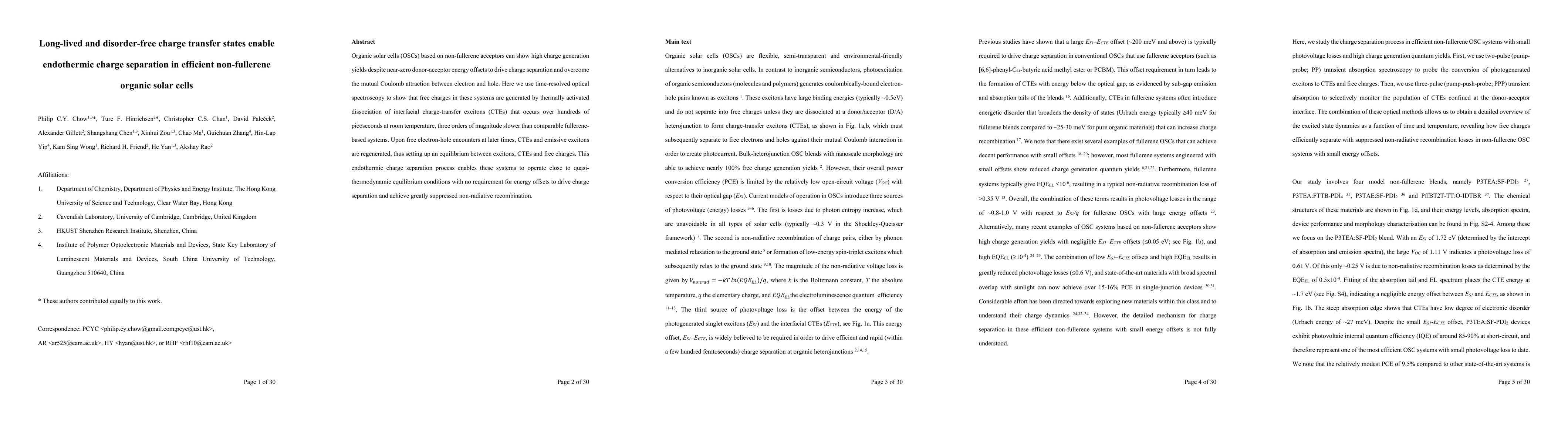 This paper demonstrates that non-fullerene organic solar cells achieve high charge generation yields through long-lived, disorder-free charge-transfer states, which enable endothermic charge separation without energy offsets, leading to suppressed non-radiative recombination. Time-resolved spectroscopy reveals that charge separation occurs via thermally activated dissociation of charge-transfer excitons over hundreds of picoseconds.
