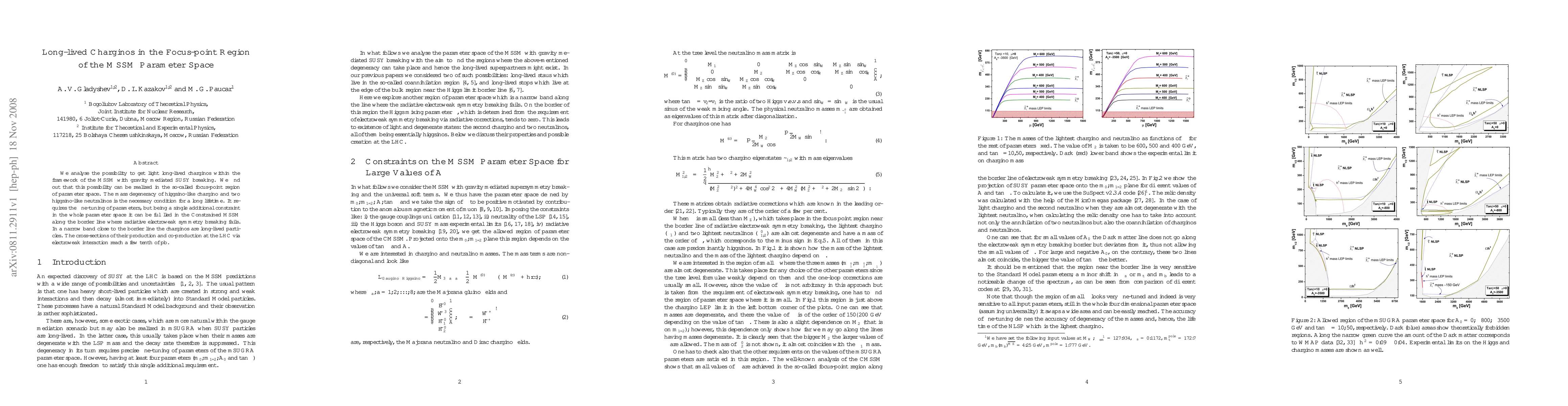 We analyse the possibility to get light long-lived charginos within the framework of the MSSM with gravity mediated SUSY breaking. We find out that this possibility can be realized in the so-called focus-point region of parameter space. The mass degeneracy of higgsino-like chargino and two higgsino-like neutralinos is the necessary condition for a long lifetime. It requires the fine-tuning of parameters, but being a single additional constraint in the whole parameter space it can be fulfilled in the Constrained MSSM along the border line where radiative electroweak symmetry breaking fails. In a narrow band close to the border line the charginos are long-lived particles. The cross-sections of their production and co-production at the LHC via electroweak interaction reach a few tenth of pb.