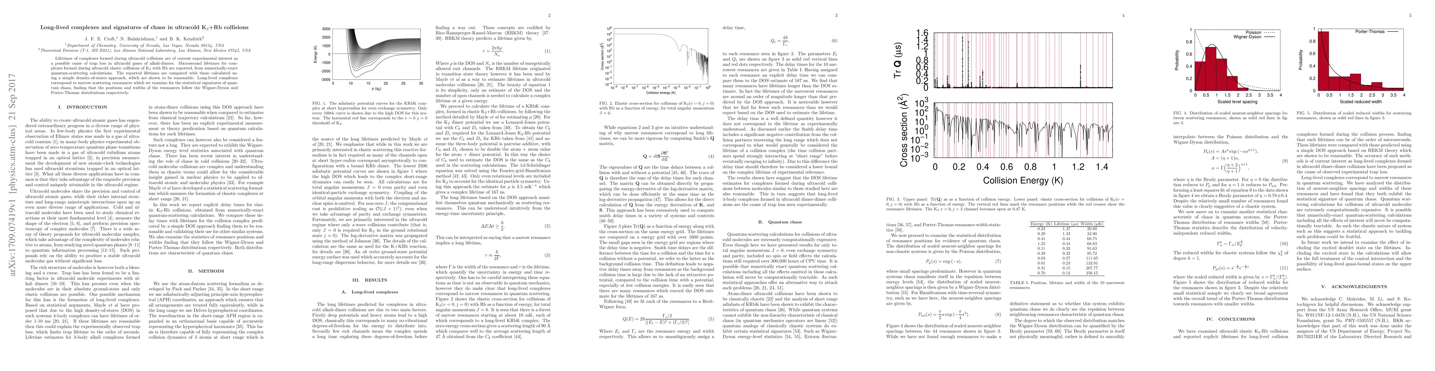 This paper reports microsecond lifetimes for long-lived complexes formed during ultracold K2+Rb collisions, revealing narrow scattering resonances. The study finds statistical signatures of quantum chaos in the resonances' positions and widths, aligning with the Wigner-Dyson and Porter-Thomas distributions.