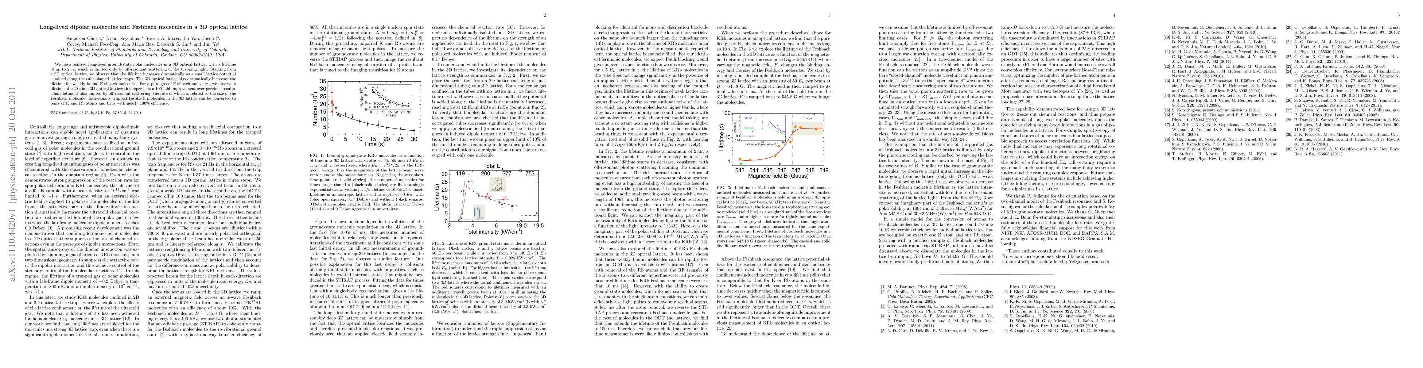 This paper reports the creation of long-lived ground-state polar molecules and Feshbach molecules in a 3D optical lattice, achieving lifetimes of up to 25 seconds, significantly improved by the addition of a small lattice potential. The study also demonstrates a 100-fold increase in the lifetime of Feshbach molecules in a 3D optical lattice compared to previous results.