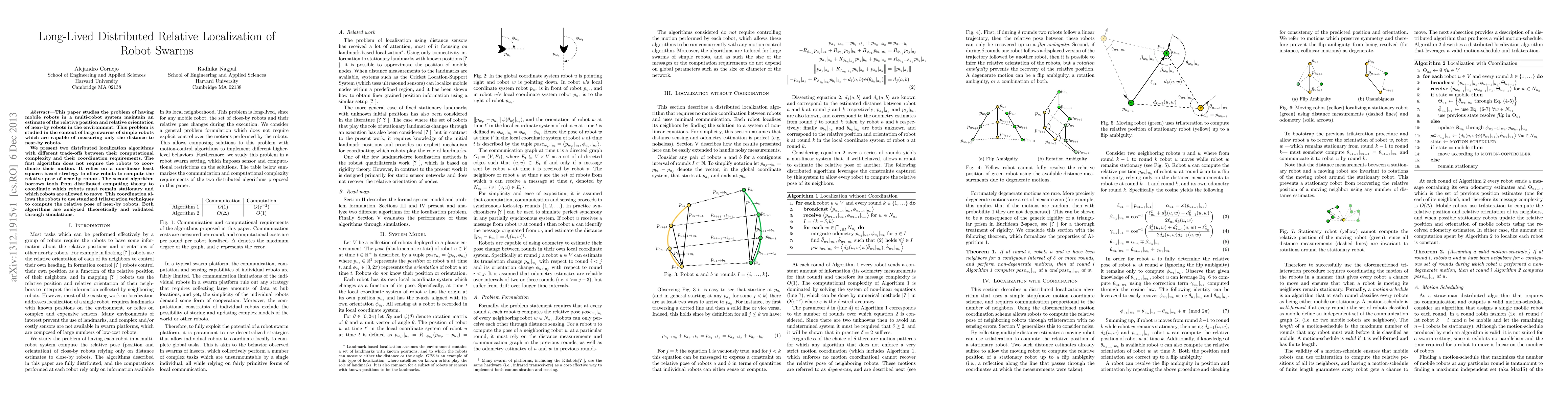 This paper studies the problem of having mobile robots in a multi-robot system maintain an estimate of the relative position and relative orientation of near-by robots in the environment. This problem is studied in the context of large swarms of simple robots which are capable of measuring only the distance to near-by robots. We present two distributed localization algorithms with different trade-offs between their computational complexity and their coordination requirements. The first algorithm does not require the robots to coordinate their motion. It relies on a non-linear least squares based strategy to allow robots to compute the relative pose of near-by robots. The second algorithm borrows tools from distributed computing theory to coordinate which robots must remain stationary and which robots are allowed to move. This coordination allows the robots to use standard trilateration techniques to compute the relative pose of near-by robots. Both algorithms are analyzed theoretically and validated through simulations.