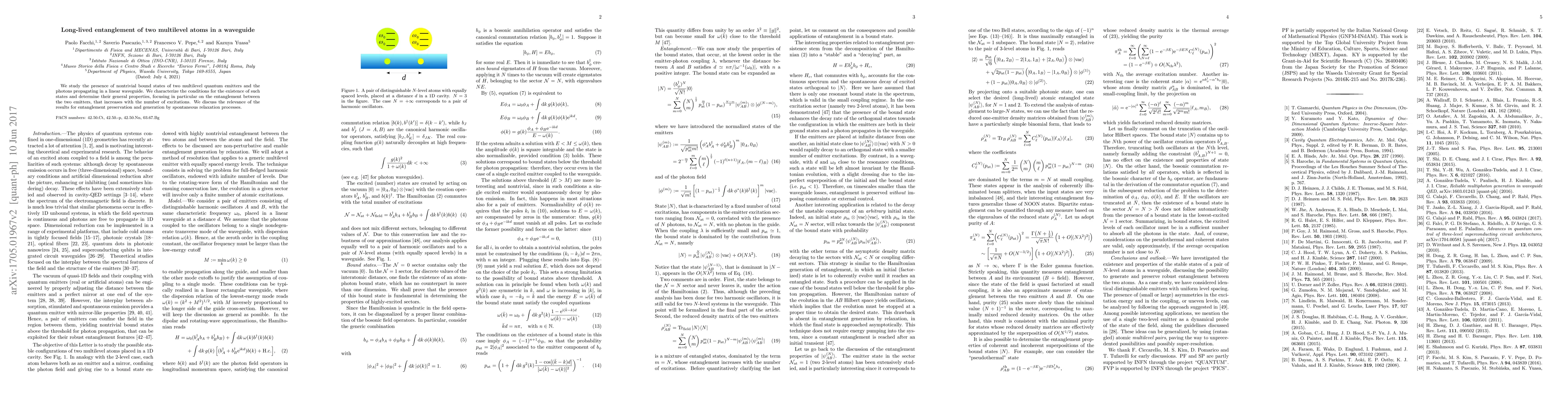 We study the presence of nontrivial bound states of two multilevel quantum emitters and the photons propagating in a linear waveguide. We characterize the conditions for the existence of such states and determine their general properties, focusing in particular on the entanglement between the two emitters, that increases with the number of excitations. We discuss the relevance of the results for entanglement preservation and generation by spontaneous relaxation processes.