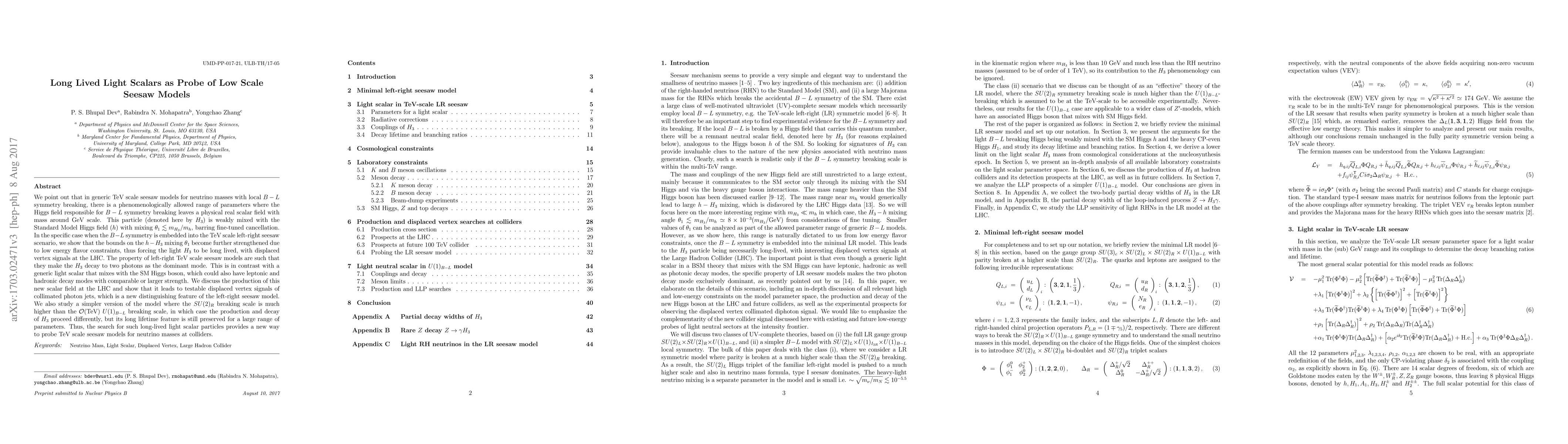 This paper explores the existence of long-lived light scalars in TeV scale seesaw models with local $B-L$ symmetry breaking, showing that these scalars, denoted $H_3$, can be produced at the LHC and decay predominantly to two photons. The study highlights the potential for displaced vertex signals at colliders as a unique probe of these models.
