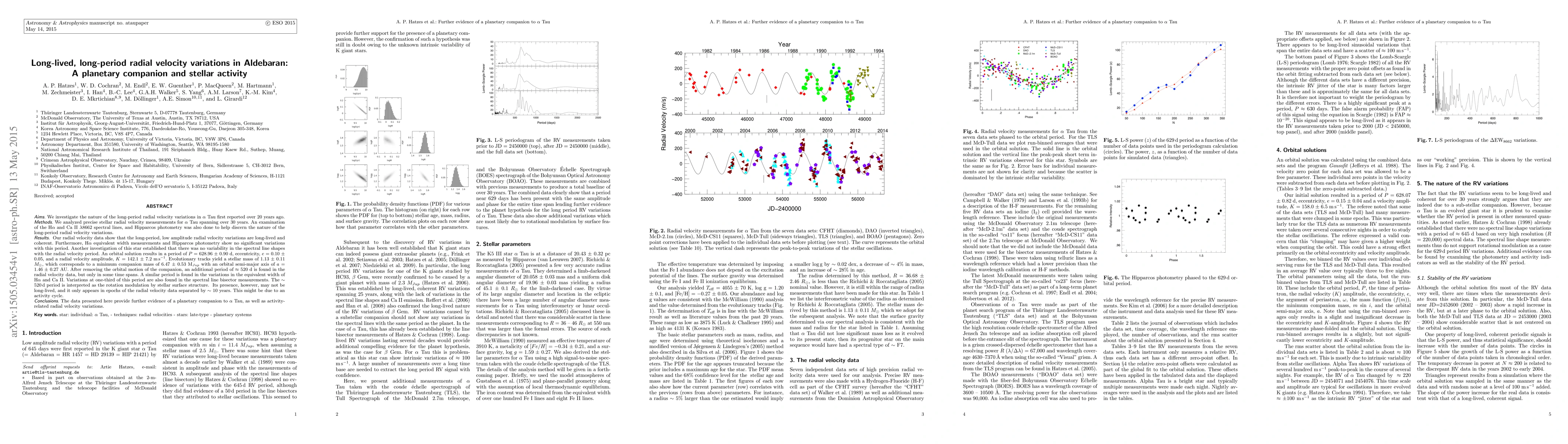 This study identifies long-lived, coherent radial velocity variations in Aldebaran (Alpha Tau) due to a planetary companion with a period of 628.96 days. Additional periodic activity variations with a ~520-day period suggest stellar rotation modulation, possibly linked to an activity cycle.