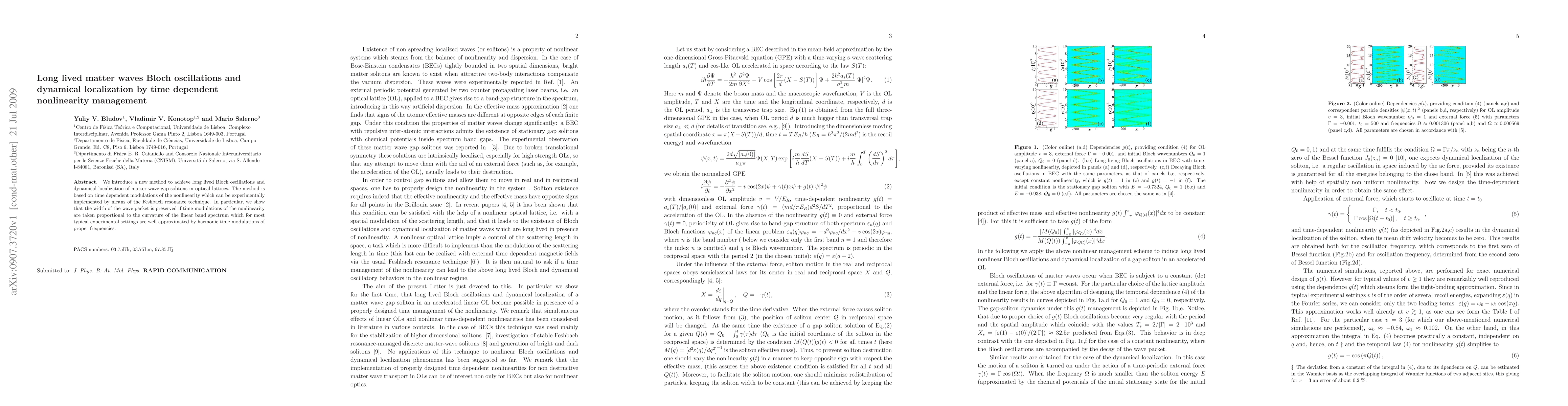 This paper proposes a novel method to sustain long-lived Bloch oscillations and dynamical localization of matter wave solitons in optical lattices using time-dependent modulations of nonlinearity, achievable via Feshbach resonance. The technique preserves wave packet width through harmonic modulations proportional to the linear band spectrum curvature.