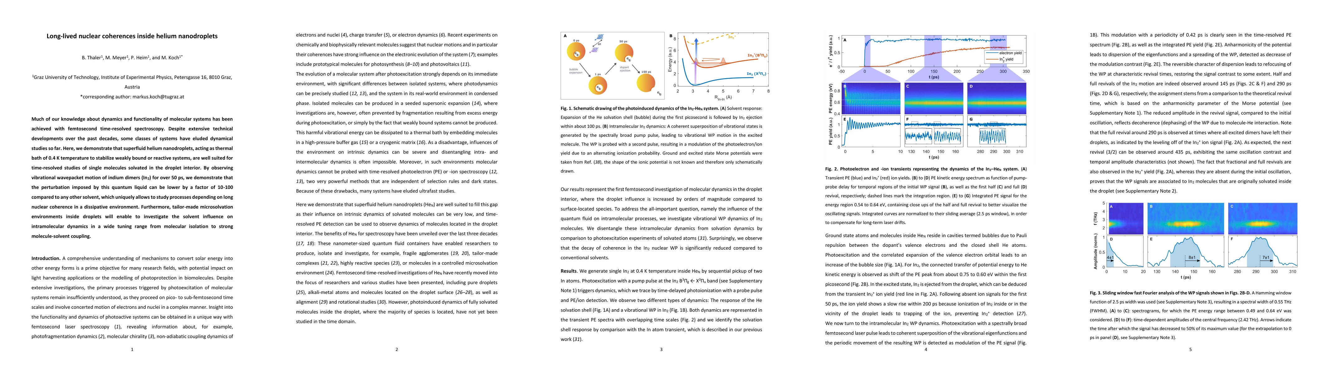 This paper demonstrates that superfluid helium nanodroplets provide a unique thermal bath environment at 0.4 K, enabling the study of long-lived nuclear coherences in molecular systems, as evidenced by 50 ps observation of indium dimer vibrational wavepacket motion. This environment offers significantly lower perturbation compared to other solvents, allowing detailed investigation of processes dependent on long nuclear coherence.