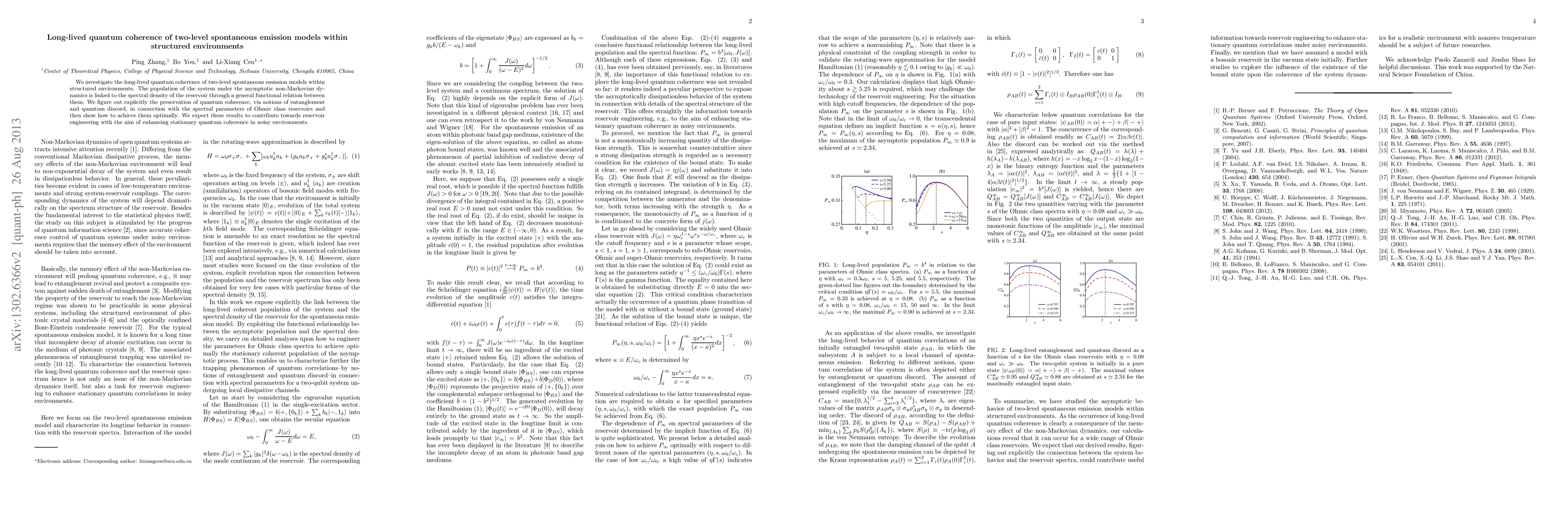 This paper explores the long-lived quantum coherence in two-level systems undergoing spontaneous emission in structured environments, revealing a functional link between system dynamics and the spectral density of the reservoir. It demonstrates how quantum coherence, measured by entanglement and quantum discord, can be optimally preserved in Ohmic class reservoirs, potentially aiding in the engineering of environments that enhance stationary quantum coherence.