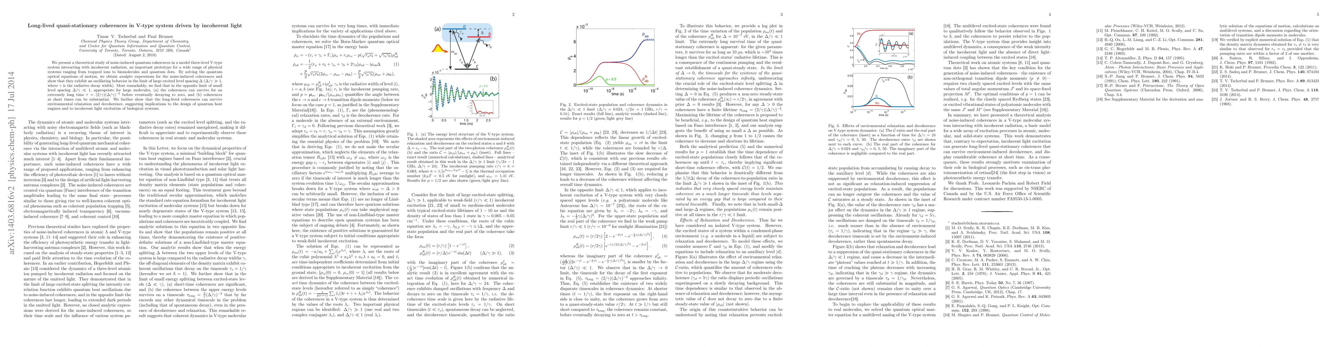 This study investigates the formation of long-lived quasi-stationary coherences in a V-type quantum system driven by incoherent light, revealing their oscillating behavior and robustness against decay. The findings suggest potential applications in quantum heat engines and biological systems.