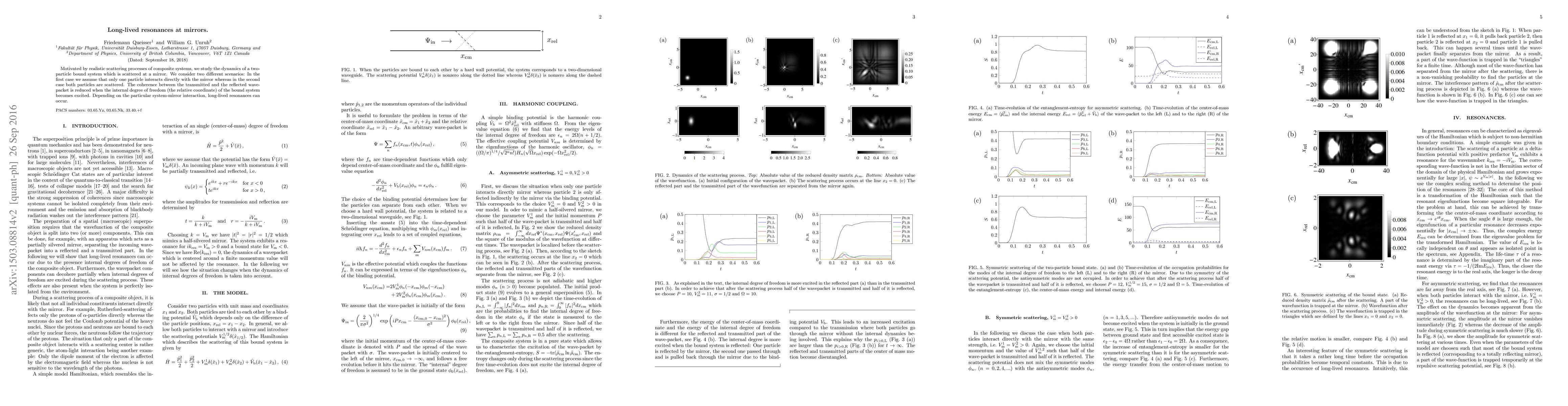 Motivated by realistic scattering processes of composite systems, we study the dynamics of a two-particle bound system which is scattered at a mirror. The physics of the scattering process will be discussed in the cases when only one particle interacts directly with the mirror and when both particles are scattered directly. It is shown that the coherence between the transmitted and the reflected wave-packet becomes reduced due to the scattering process. When both particles interact directly with the mirror, the system exhibits long-lived resonances. The results should be of interest for interference experiments with composite systems.