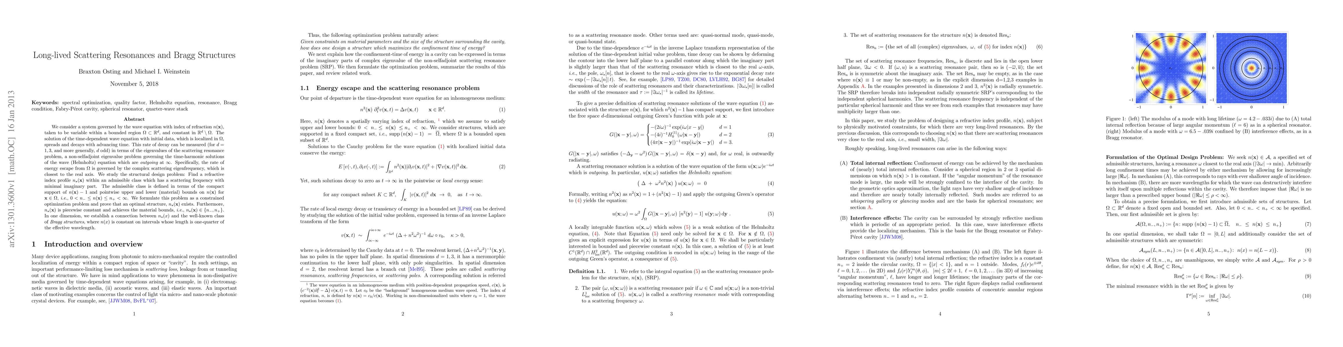 We consider a system governed by the wave equation with index of refraction $n(x)$, taken to be variable within a bounded region $\Omega\subset \mathbb R^d$, and constant in $\mathbb R^d \setminus \Omega$. The solution of the time-dependent wave equation with initial data, which is localized in $\Omega$, spreads and decays with advancing time. This rate of decay can be measured (for $d=1,3$, and more generally, $d$ odd) in terms of the eigenvalues of the scattering resonance problem, a non-selfadjoint eigenvalue problem governing the time-harmonic solutions of the wave (Helmholtz) equation which are outgoing at $\infty$. Specifically, the rate of energy escape from $\Omega$ is governed by the complex scattering eigenfrequency, which is closest to the real axis. We study the structural design problem: Find a refractive index profile $n_*(x)$ within an admissible class which has a scattering frequency with minimal imaginary part. The admissible class is defined in terms of the compact support of $n(x)-1$ and pointwise upper and lower (material) bounds on $n(x)$ for $x \in \Omega$, i.e., $0 < n_- \leq n(x) \leq n_+ < \infty$. We formulate this problem as a constrained optimization problem and prove that an optimal structure, $n_*(x)$ exists. Furthermore, $n_*(x)$ is piecewise constant and achieves the material bounds, i.e., $n_*(x) \in {n_-, n_+} $. In one dimension, we establish a connection between $n_*(x)$ and the well-known class of Bragg structures, where $n(x)$ is constant on intervals whose length is one-quarter of the effective wavelength.