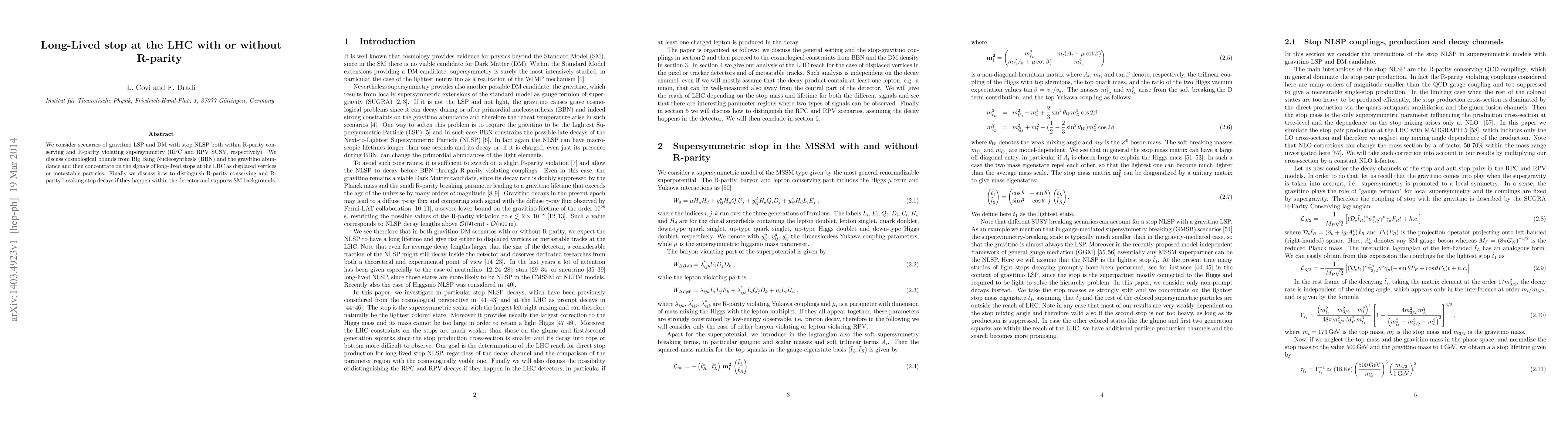 We consider scenarios of gravitino LSP and DM with stop NLSP both within R-parity conserving and R-parity violating supersymmetry (RPC and RPV SUSY, respectively). We discuss cosmological bounds from Big Bang Nucleosynthesis (BBN) and the gravitino abundance and then concentrate on the signals of long-lived stops at the LHC as displaced vertices or metastable particles. Finally we discuss how to distinguish R-parity conserving and R-parity breaking stop decays if they happen within the detector and suppress SM backgrounds.