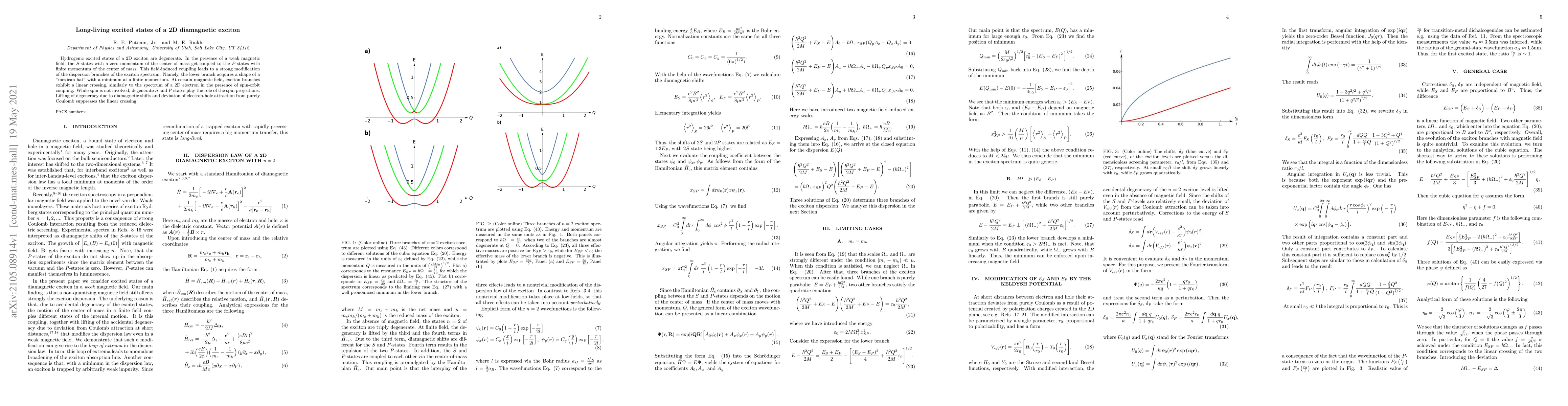 This paper investigates the long-living excited states of a 2D diamagnetic exciton, revealing how a weak magnetic field induces coupling between degenerate $S$ and $P$ states, resulting in a modified "mexican hat" shape dispersion and a linear crossing in the exciton spectrum akin to spin-orbit coupling. The study highlights the role of diamagnetic shifts and deviations in electron-hole attraction in suppressing the linear crossing.