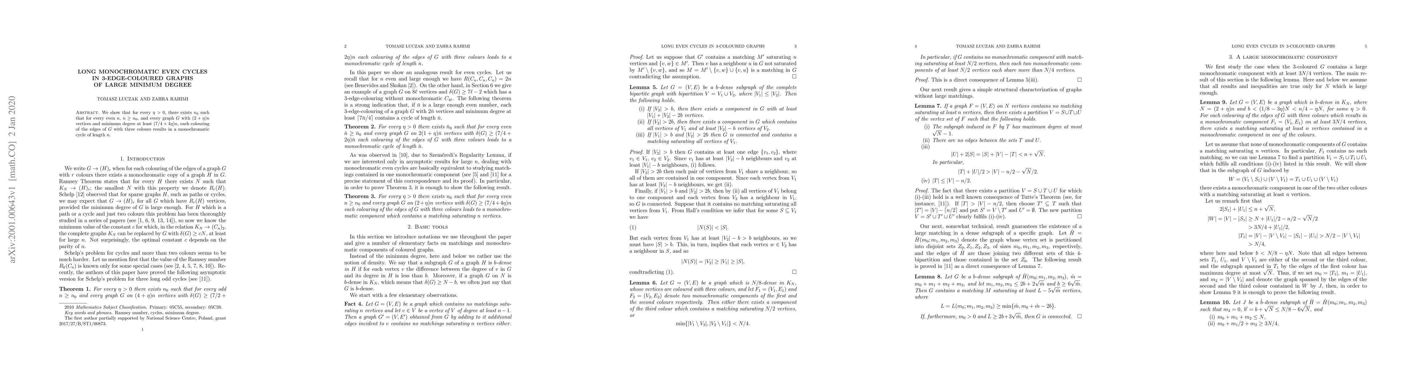 Summary: The paper proves that for any small positive $\eta$, there exists a sufficiently large $n_0$ such that any graph with $(2+\eta)n$ vertices and minimum degree $(7/4+4\eta)n$ will contain a monochromatic cycle of length $n$ when its edges are coloured with three colours.