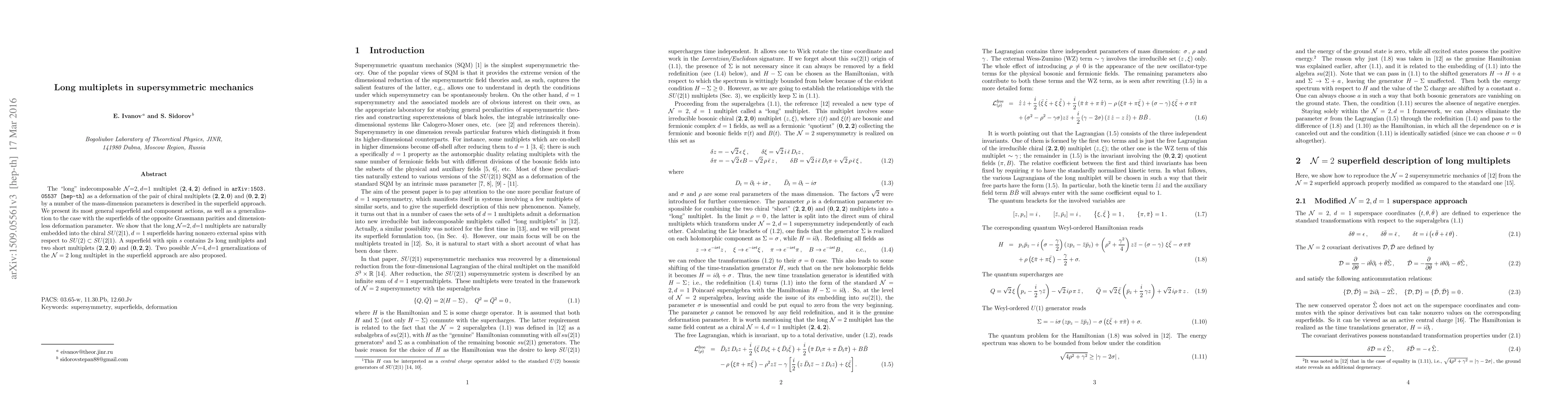 The "long" indecomposable N=2, d=1 multiplet (2, 4, 2) defined in arXiv:1503.05537 [hep-th] as a deformation of the pair of chiral multiplets (2, 2, 0) and (0, 2, 2) by a number of the mass-dimension parameters is described in the superfield approach. We present its most general superfield and component actions, as well as a generalization to the case with the superfields of the opposite Grassmann parities and dimensionless deformation parameter. We show that the long N=2, d=1 multiplets are naturally embedded into the chiral SU(2|1), d=1 superfields having nonzero external spins with respect to SU(2) \subset SU(2|1). A superfield with spin s contains 2s long multiplets and two short multiplets (2, 2, 0) and (0, 2, 2). Two possible N=4, d=1 generalizations of the N=2 long multiplet in the superfield approach are also proposed.