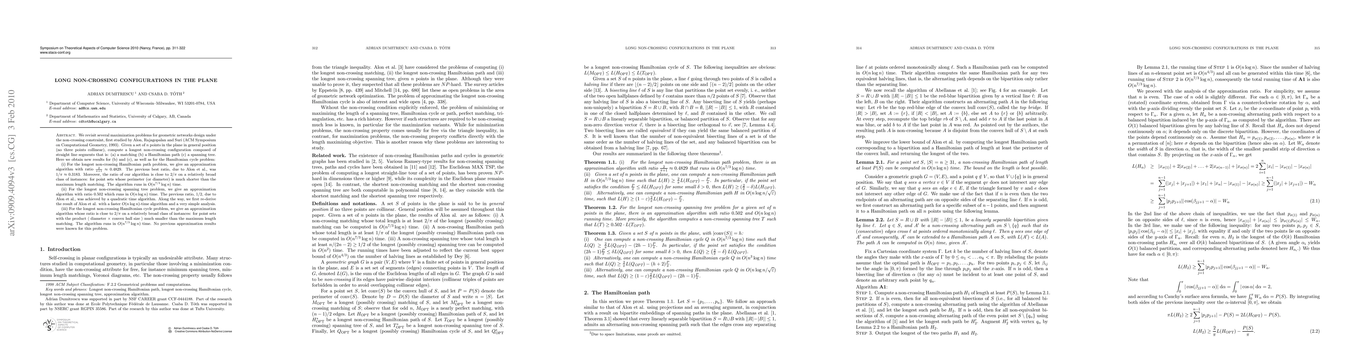 We revisit several maximization problems for geometric networks design under the non-crossing constraint, first studied by Alon, Rajagopalan and Suri (ACM Symposium on Computational Geometry, 1993). Given a set of $n$ points in the plane in general position (no three points collinear), compute a longest non-crossing configuration composed of straight line segments that is: (a) a matching (b) a Hamiltonian path (c) a spanning tree. Here we obtain new results for (b) and (c), as well as for the Hamiltonian cycle problem: (i) For the longest non-crossing Hamiltonian path problem, we give an approximation algorithm with ratio $\frac{2}{\pi+1} \approx 0.4829$. The previous best ratio, due to Alon et al., was $1/\pi \approx 0.3183$. Moreover, the ratio of our algorithm is close to $2/\pi$ on a relatively broad class of instances: for point sets whose perimeter (or diameter) is much shorter than the maximum length matching. The algorithm runs in $O(n^{7/3}\log{n})$ time. (ii) For the longest non-crossing spanning tree problem, we give an approximation algorithm with ratio 0.502 which runs in $O(n \log{n})$ time. The previous ratio, 1/2, due to Alon et al., was achieved by a quadratic time algorithm. Along the way, we first re-derive the result of Alon et al. with a faster $O(n \log{n})$-time algorithm and a very simple analysis. (iii) For the longest non-crossing Hamiltonian cycle problem, we give an approximation algorithm whose ratio is close to $2/\pi$ on a relatively broad class of instances: for point sets with the product $\bf{<}$diameter$\times$ convex hull size $\bf{>}$ much smaller than the maximum length matching. The algorithm runs in $O(n^{7/3}\log{n})$ time. No previous approximation results were known for this problem.