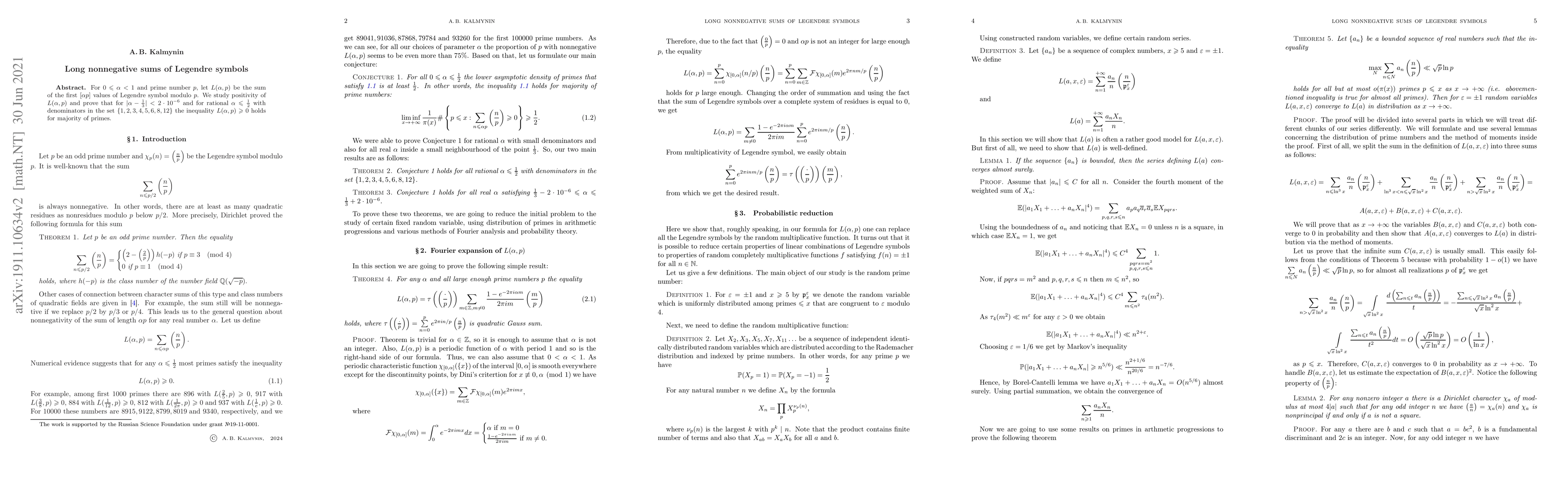 For $0\leq \alpha<1$ and prime number $p$ let $L(\alpha,p)$ be the sum of the first $[\alpha p]$ values of Legendre symbol modulo $p$. We study positivity of $L(\alpha,p)$ and prove that for $|\alpha-\frac13|<2\cdot 10^{-6}$ and for rational $\alpha\leq \frac12$ with denominators in the set $\{1,2,3,4,5,6,8,12\}$ the inequality $L(\alpha,p)\geq 0$ holds for majority of primes.