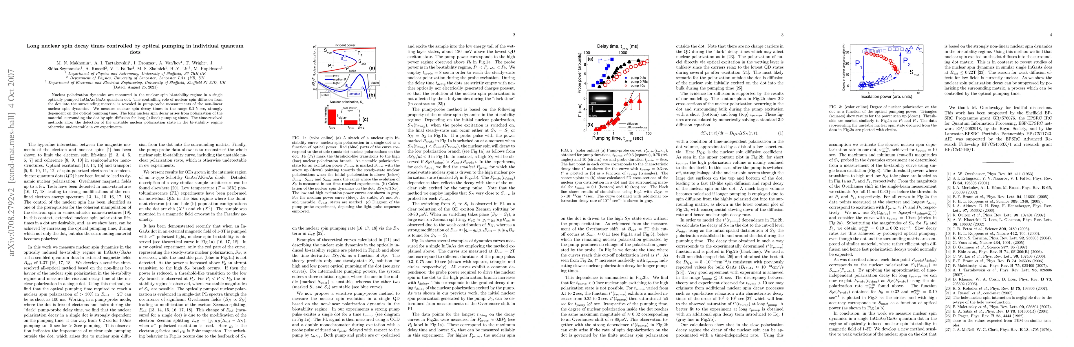 Summary: Researchers measure nuclear spin decay times in individual quantum dots under optical pumping, finding decay times ranging from 0.2 to 5 seconds. Long decay times, exceeding 5 seconds, are attributed to spin diffusion into surrounding material, revealing the unstable nuclear polarization state in the bi-stability regime.