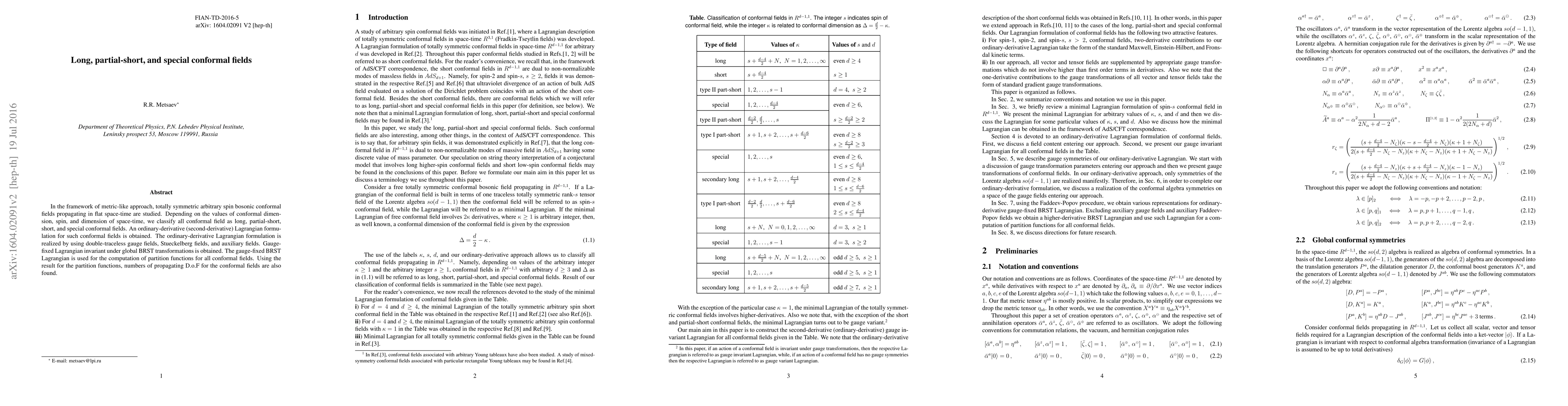 This paper classifies totally symmetric arbitrary spin bosonic conformal fields in flat space-time into long, partial-short, short, and special types based on their conformal dimension, spin, and space-time dimension. It develops an ordinary-derivative Lagrangian formulation using gauge fields and auxiliary fields, and computes partition functions and propagating degrees of freedom for these fields.