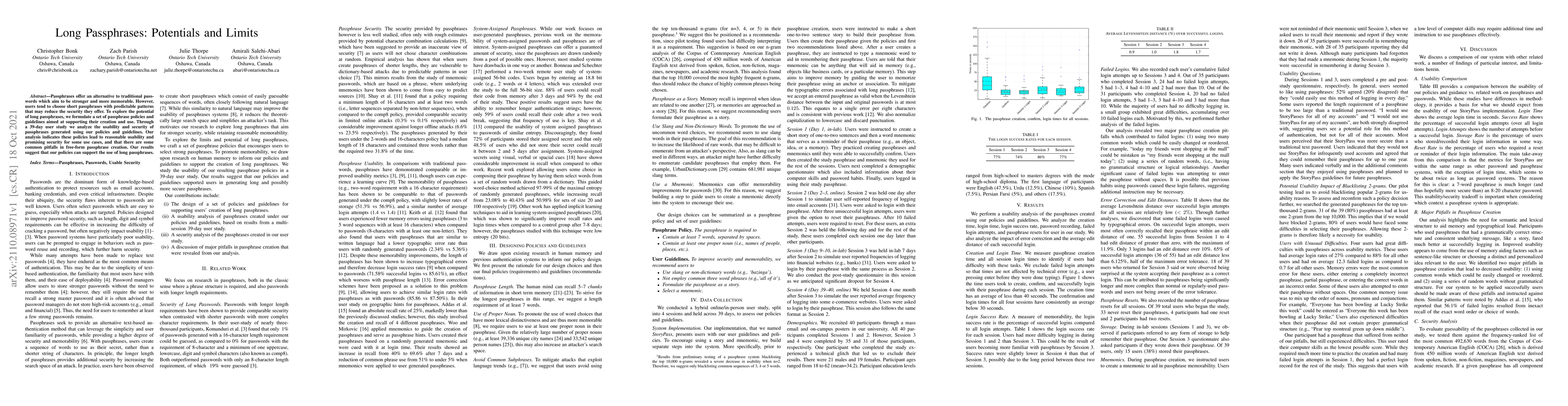 This study explores the potential and limitations of long passphrases as a secure yet memorable alternative to traditional passwords. Through a 39-day user study, it evaluates the usability and security of passphrases generated using formulated policies and guidelines, finding reasonable usability and promising security, while also highlighting common pitfalls in free-form passphrase creation.
