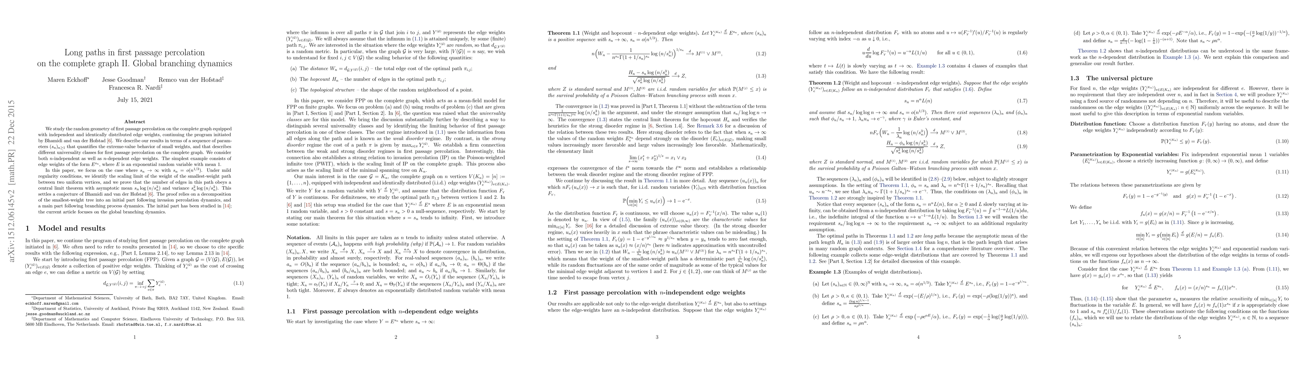 This paper investigates the global branching dynamics in first passage percolation on the complete graph with independent edge weights, extending previous work by Bhamidi and van der Hofstad. It identifies the scaling limit of the smallest-weight path between two vertices and proves a central limit theorem for the number of edges in this path, settling a conjecture by confirming the asymptotic mean and variance.