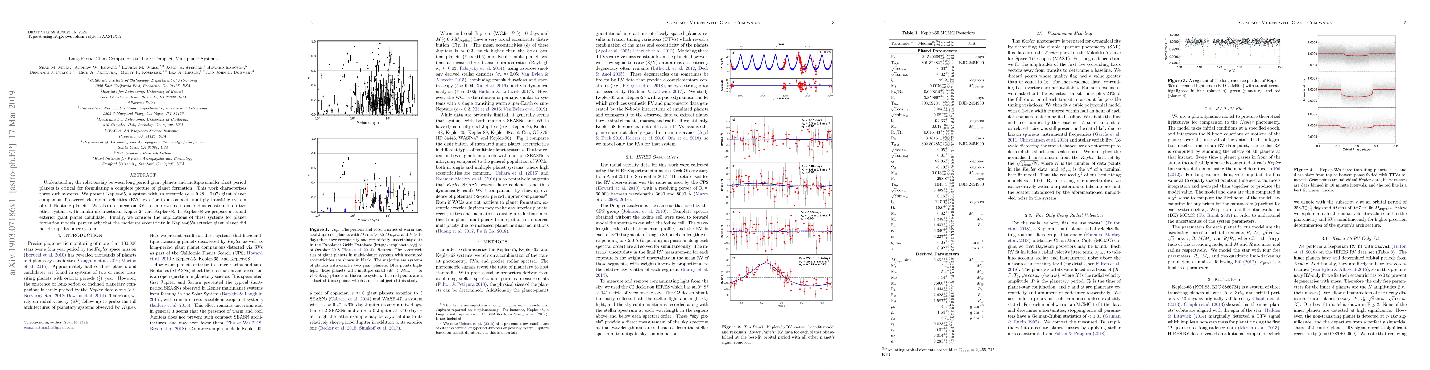Understanding the relationship between long-period giant planets and multiple smaller short-period planets is critical for formulating a complete picture of planet formation. This work characterizes three such systems. We present Kepler-65, a system with an eccentric (e=0.28+/-0.07) giant planet companion discovered via radial velocities (RVs) exterior to a compact, multiply-transiting system of sub-Neptune planets. We also use precision RVs to improve mass and radius constraints on two other systems with similar architectures, Kepler-25 and Kepler-68. In Kepler-68 we propose a second exterior giant planet candidate. Finally, we consider the implications of these systems for planet formation models, particularly that the moderate eccentricity in Kepler-65's exterior giant planet did not disrupt its inner system.