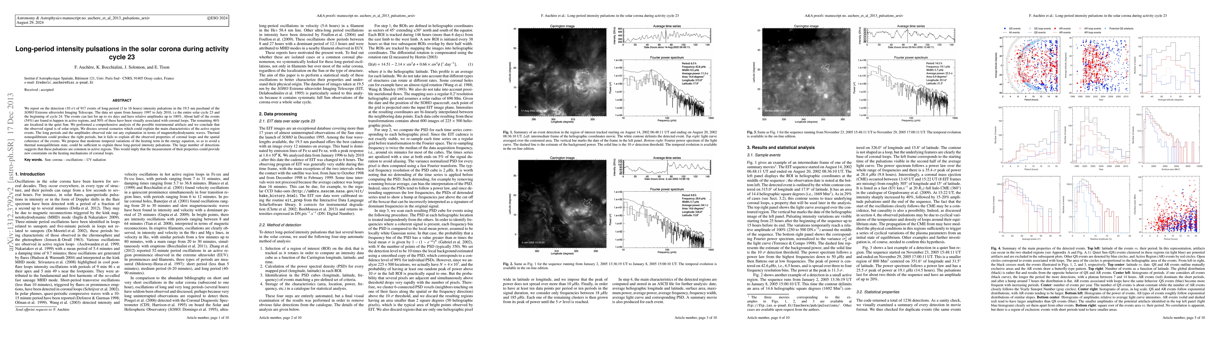 We report on the detection (10 \sigma) of 917 events of long-period (3 to 16 hours) intensity pulsations in the 19.5 nm passband of the SOHO Extreme ultraviolet Imaging Telescope. The data set spans from January 1997 to July 2010, i.e the entire solar cycle 23 and the beginning of cycle 24. The events can last for up to six days and have relative amplitudes up to 100%. About half of the events (54%) are found to happen in active regions, and 50% of these have been visually associated with coronal loops. The remaining 46% are localized in the quiet Sun. We performed a comprehensive analysis of the possible instrumental artifacts and we conclude that the observed signal is of solar origin. We discuss several scenarios which could explain the main characteristics of the active region events. The long periods and the amplitudes observed rule out any explanation in terms of magnetohydrodynamic waves. Thermal nonequilibrium could produce the right periods, but it fails to explain all the observed properties of coronal loops and the spatial coherence of the events. We propose that moderate temporal variations of the heating term in the energy equation, so as to avoid a thermal nonequilibrium state, could be sufficient to explain those long-period intensity pulsations. The large number of detections suggests that these pulsations are common in active regions. This would imply that the measurement of their properties could provide new constraints on the heating mechanisms of coronal loops.