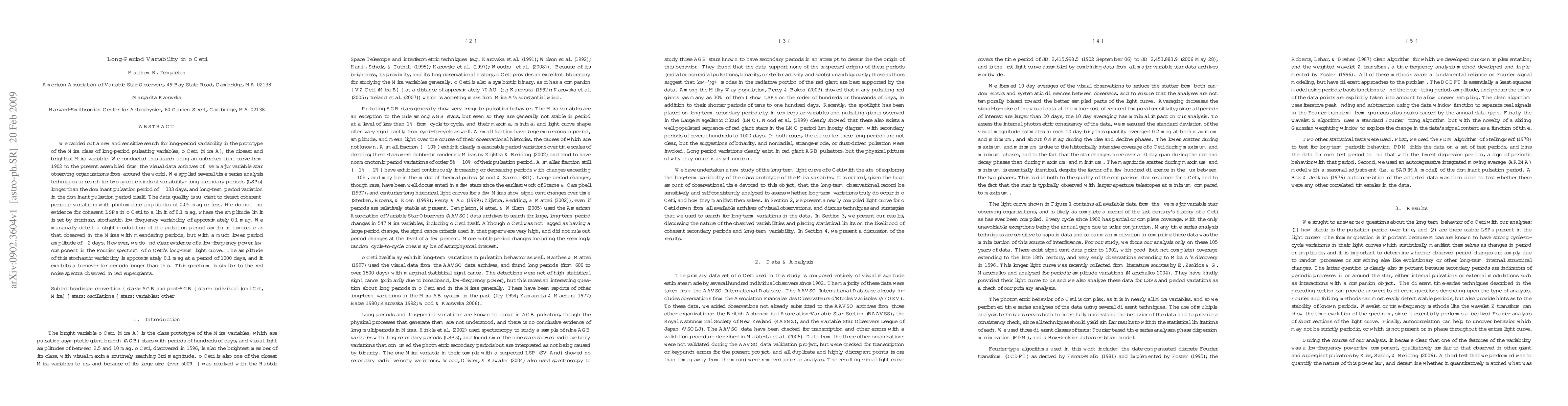 We carried out a new and sensitive search for long-period variability in the prototype of the Mira class of long-period pulsating variables, o Ceti (Mira A), the closest and brightest Mira variable. We conducted this search using an unbroken light curve from 1902 to the present, assembled from the visual data archives of five major variable star observing organizations from around the world. We applied several time-series analysis techniques to search for two specific kinds of variability: long secondary periods (LSPs) longer than the dominant pulsation period of ~333 days, and long-term period variation in the dominant pulsation period itself. The data quality is sufficient to detect coherent periodic variations with photometric amplitudes of 0.05 mag or less. We do not find evidence for coherent LSPs in o Ceti to a limit of 0.1 mag, where the amplitude limit is set by intrinsic, stochastic, low-frequency variability of approximately 0.1 mag. We marginally detect a slight modulation of the pulsation period similar in timescale to that observed in the Miras with meandering periods, but with a much lower period amplitude of +/-2 days. However, we do find clear evidence of a low-frequency power-law component in the Fourier spectrum of o Ceti's long-term light curve. The amplitude of this stochastic variability is approximately 0.1 mag at a period of 1000 days, and it exhibits a turnover for periods longer than this. This spectrum is similar to the red noise spectra observed in red supergiants.