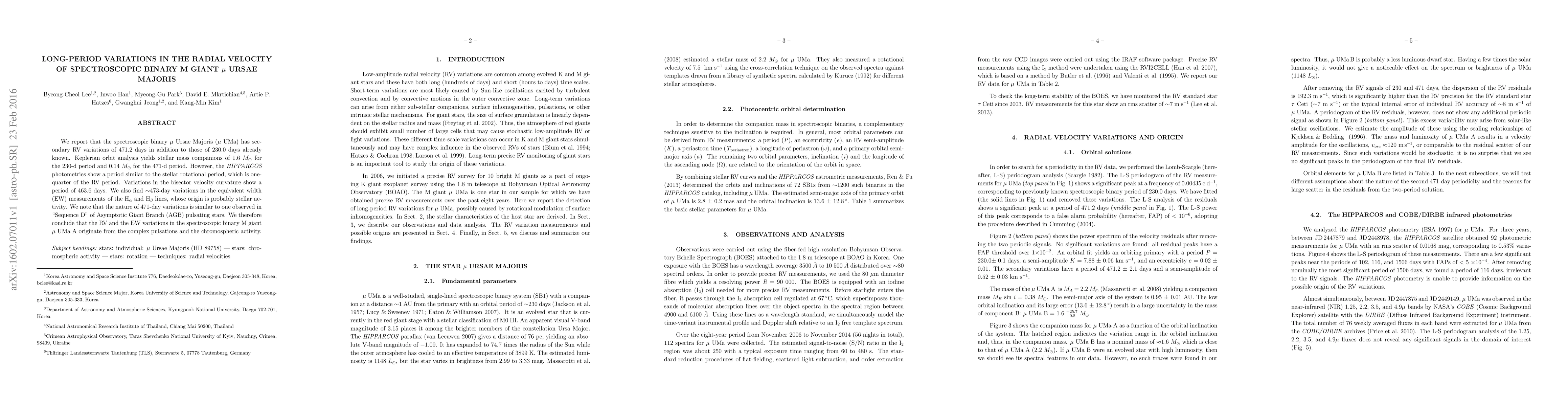 The spectroscopic binary μ UMa exhibits two secondary radial velocity variations, with periods of 471.2 days and 230.0 days, alongside stellar mass companions of 1.6 M_Sun and 0.14 M_Sun, respectively. The 471-day variations likely stem from complex pulsations and chromospheric activity, similar to those in AGB pulsating stars.