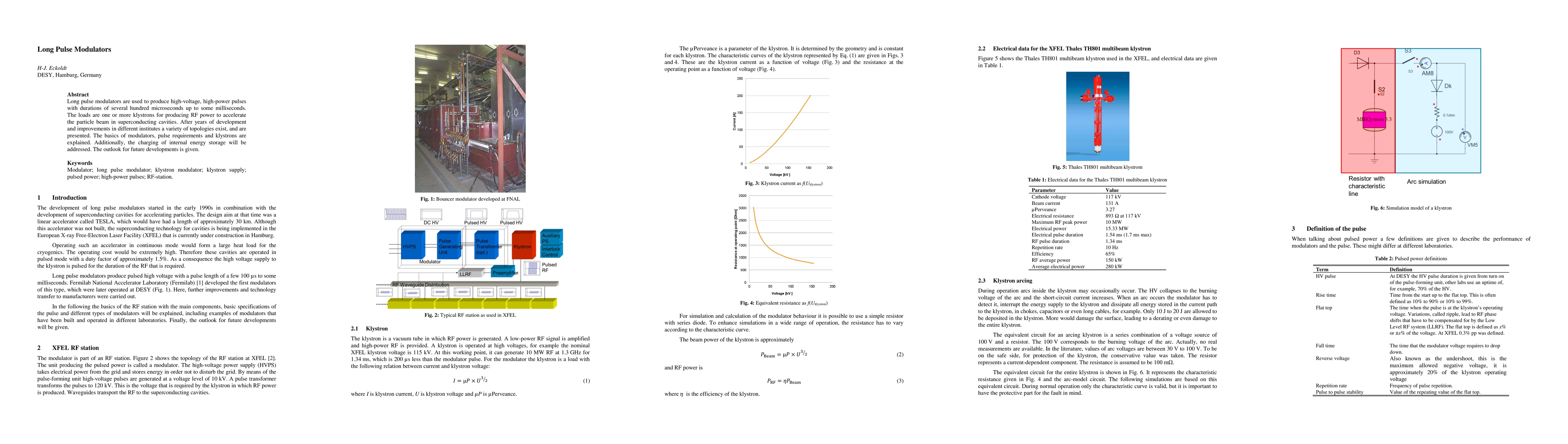 The paper discusses long pulse modulators, which generate high-voltage, high-power pulses lasting hundreds of microseconds to milliseconds, crucial for particle beam acceleration. It presents various modulator topologies, explains their basics, and discusses future development prospects.